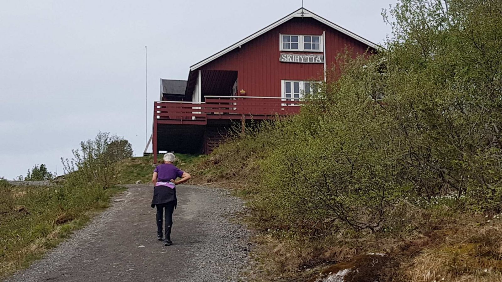 Du starter fra Damefallet, parkeringsplassen i Vardeveien. Herfra kan du følge skilting til Skihytta. Fin gruset vei helt opp. Fra parkeringsplassen kan du gå gruset sti rett opp, eller som et slakere alternativ følge lysløypa. Det er denne ruta som er beskrevet her og vist i kartet. Fra parkeringen følger du lysløypa til høyre. Først slakt nedover før veien svinger oppover mot venstre over en bru. Etter ca 400 m deler veien seg i to. Lysløypa fortsetter mot høyre, mens du skal følge turvei mot venstre uten lysmaster. Følg denne veien til Skihytta.