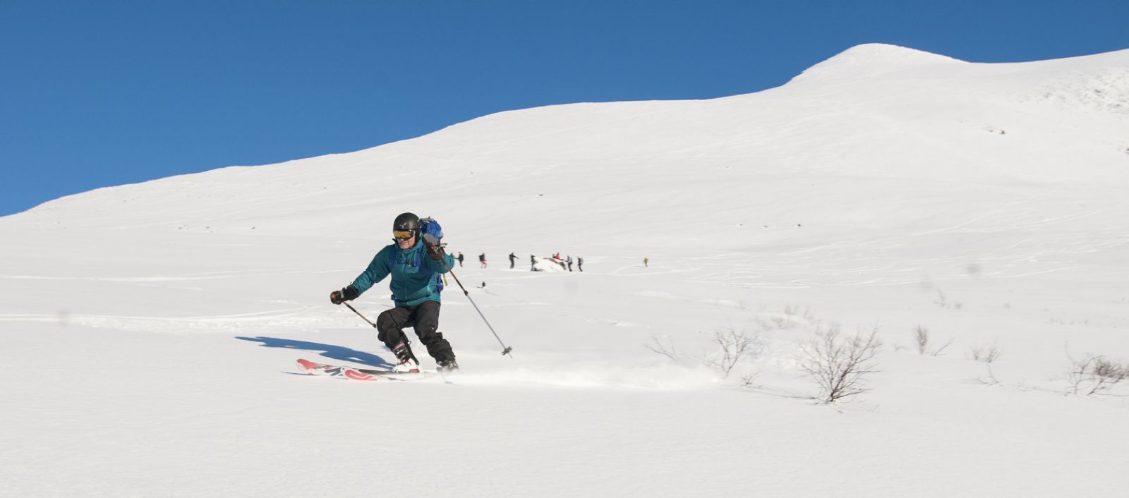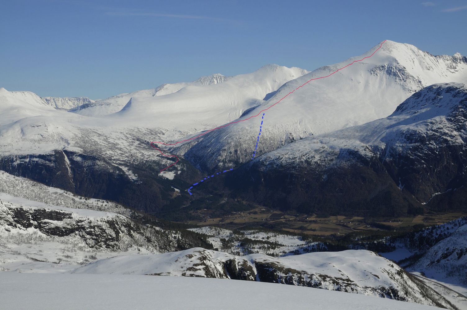 No endrar terrenget seg til ein stor og brei snøflanke. Følg ryggen i venstre del.