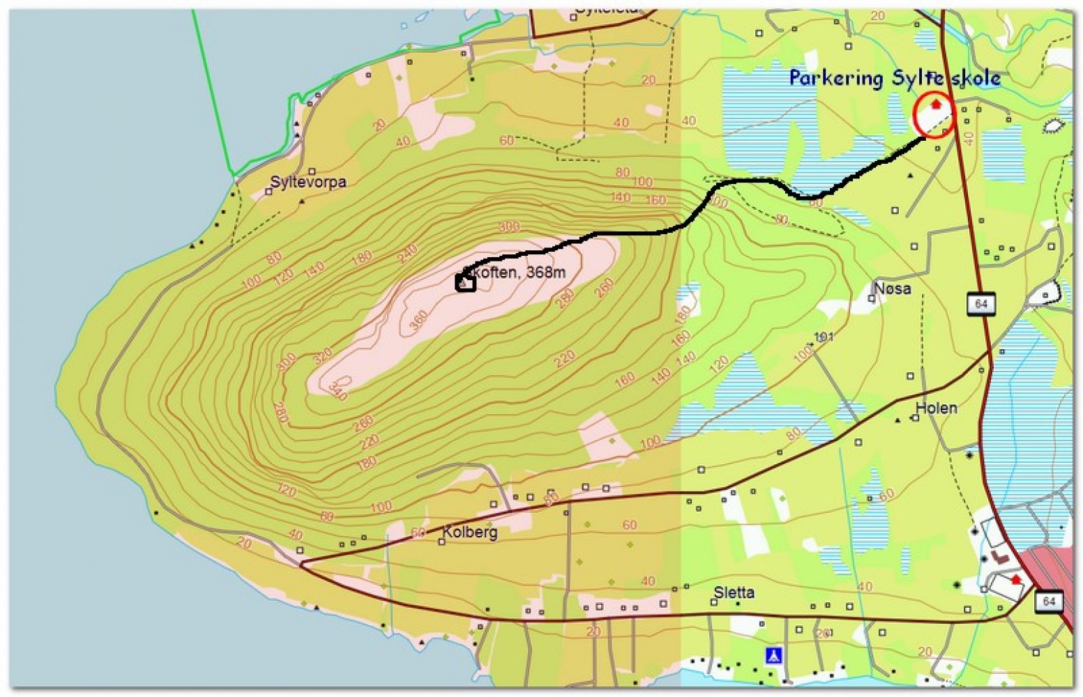 Grunnet lite parkeringsareal på sørsiden av Skoften, anbefales parkering på Sylte skole. Men en kan gå over fjellet, ned på sørsiden mot Ukkelberg (alternativt startsted., om "leikeplassen" og så tilbake til Sylte skole langs riksveien. Ca. 3 km asfalt.