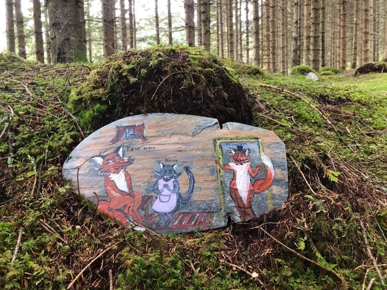 Ein lett og fin familietur på skogsveg med gapahuk der det er fint å legge inn matpause. I skogen rundt gapahuken er det plassert ut fleire motiv frå eventyr måla på skiferheller, små figurar og troll.