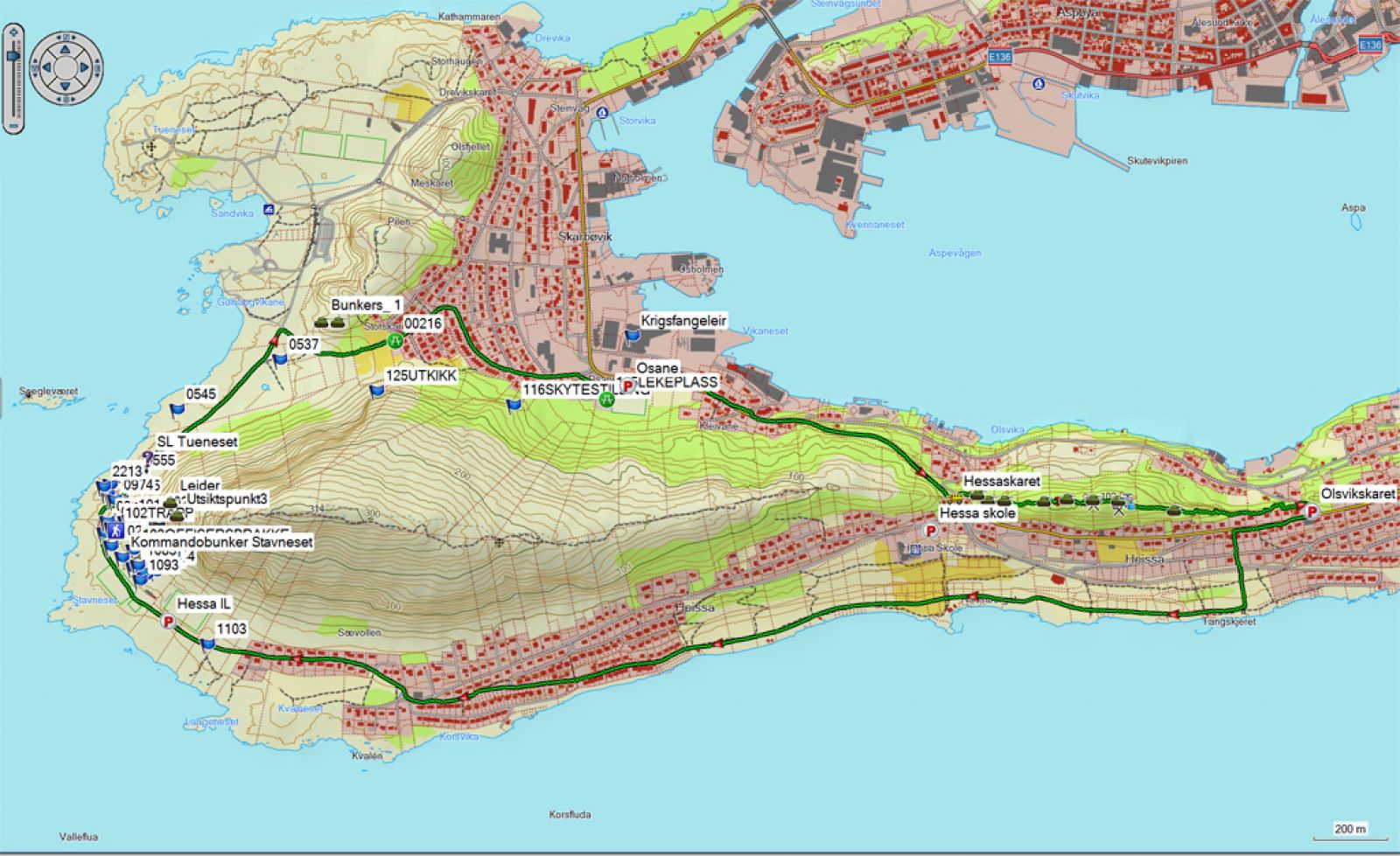 Selve turen over Skolefjellet er på ca. 1200 meter på gode stier, helt frem mot slutten v/Olsvikskaret. Du beveger deg på privateid grunn, og de sist 500 metrene går du i bakhagen til de som bor langs fjellet. Anbefaler derfor at du snur og går tilbake samme vei eller holder så god avstand til inn,arka som mulig. Hvis du starter fra Olsvikskaret eller Hessa barneskole og går hovedveien i retur tilbake til start, så er turen på ca. 3 kilometer. GPX-filen viser en rundtur, basert på at du parkerer v/Osane i Skarbøvika. Den tar deg med over Skolefjellet og ned til Hessafjorden videre rundt Stavneset opp Storskaret og ned til Osane hvor ev bil står parkert. Denne turen er på 8 kilometer i lett terreng.
