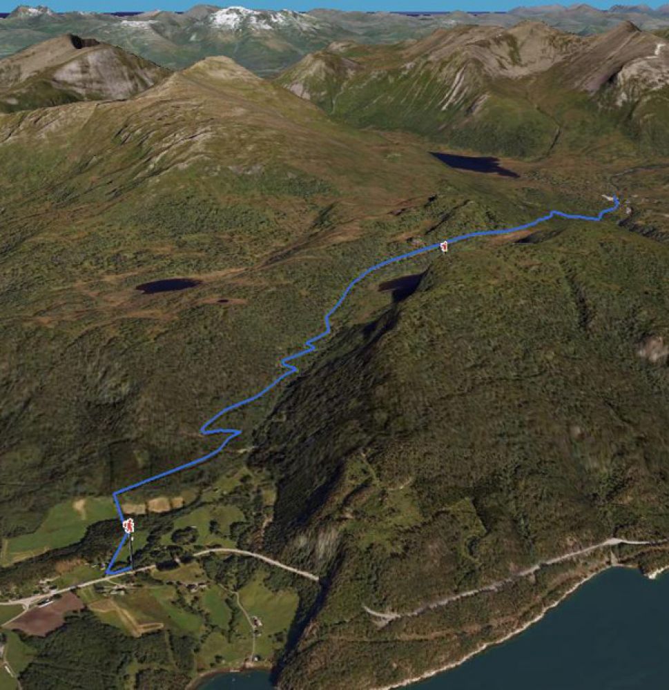 Fortsett forbi huset og fram til et jorde. På andre siden av jordet starter stigningen. Vegen slynger seg i svinger oppover fjelldalen. Litt bratt midtparti, før det legger seg siste stykket inn til Skarvatnet.