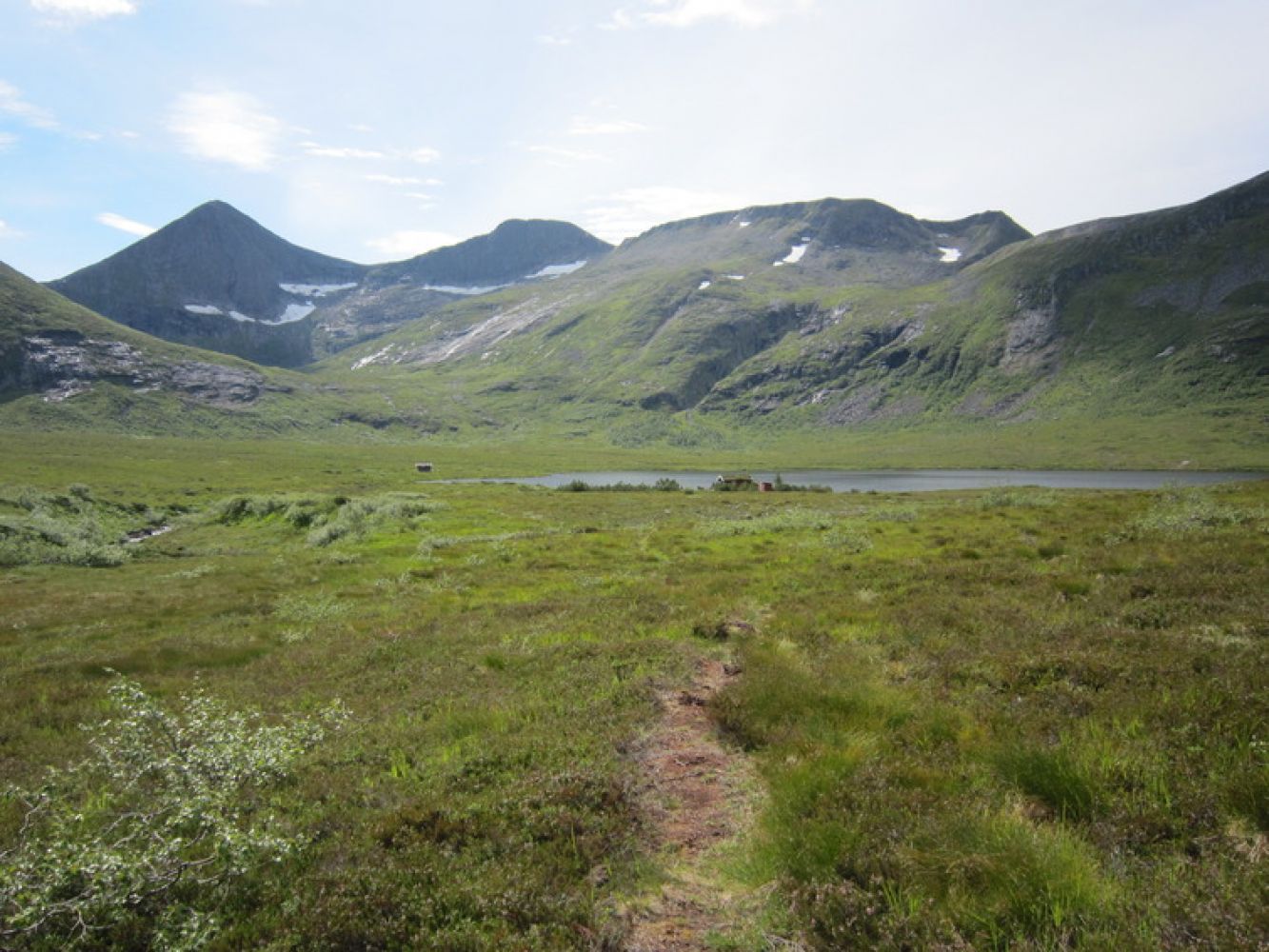 Følg vannkanten til venstre til bua i enden av vatnet. Fra bua ta til venstre inn mot en rygg og så til høyre for Gravfjelltjørna. Kryss helt over botnen og følg høyrekanten opp til skaret, og flatt videre innover til Kvassetindvatnet.