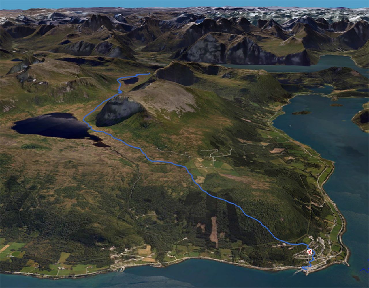 Turen er her beskrevet fra fergekaia, men en kan også starte ved parkeringa på idrettsplassen. Alternativt kan en også starte på Nysetra og spare den første stigninga (bomveg).