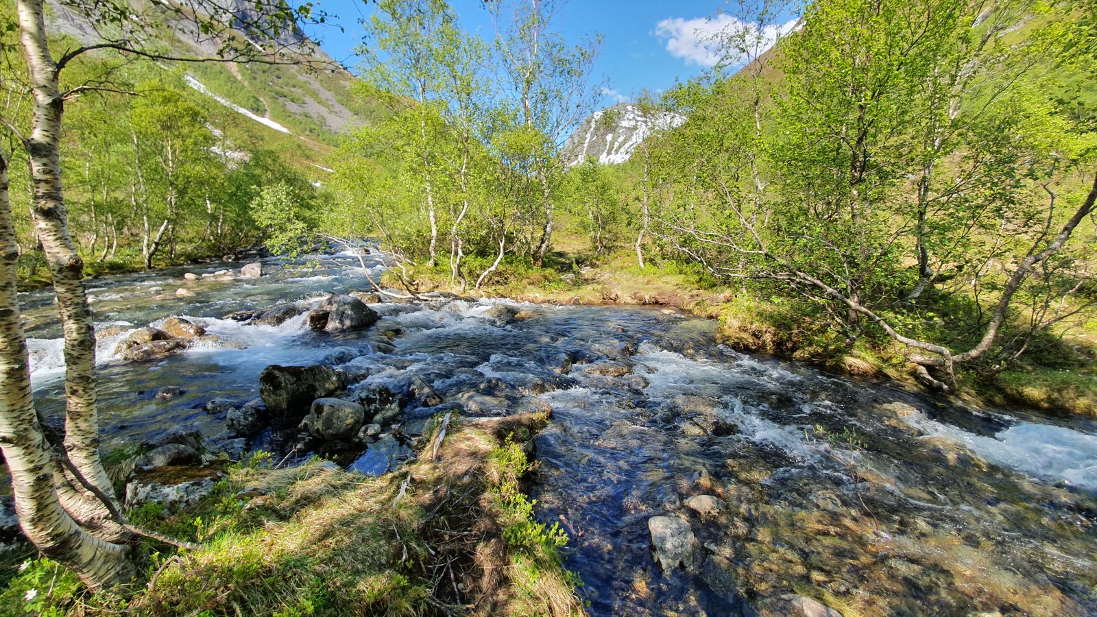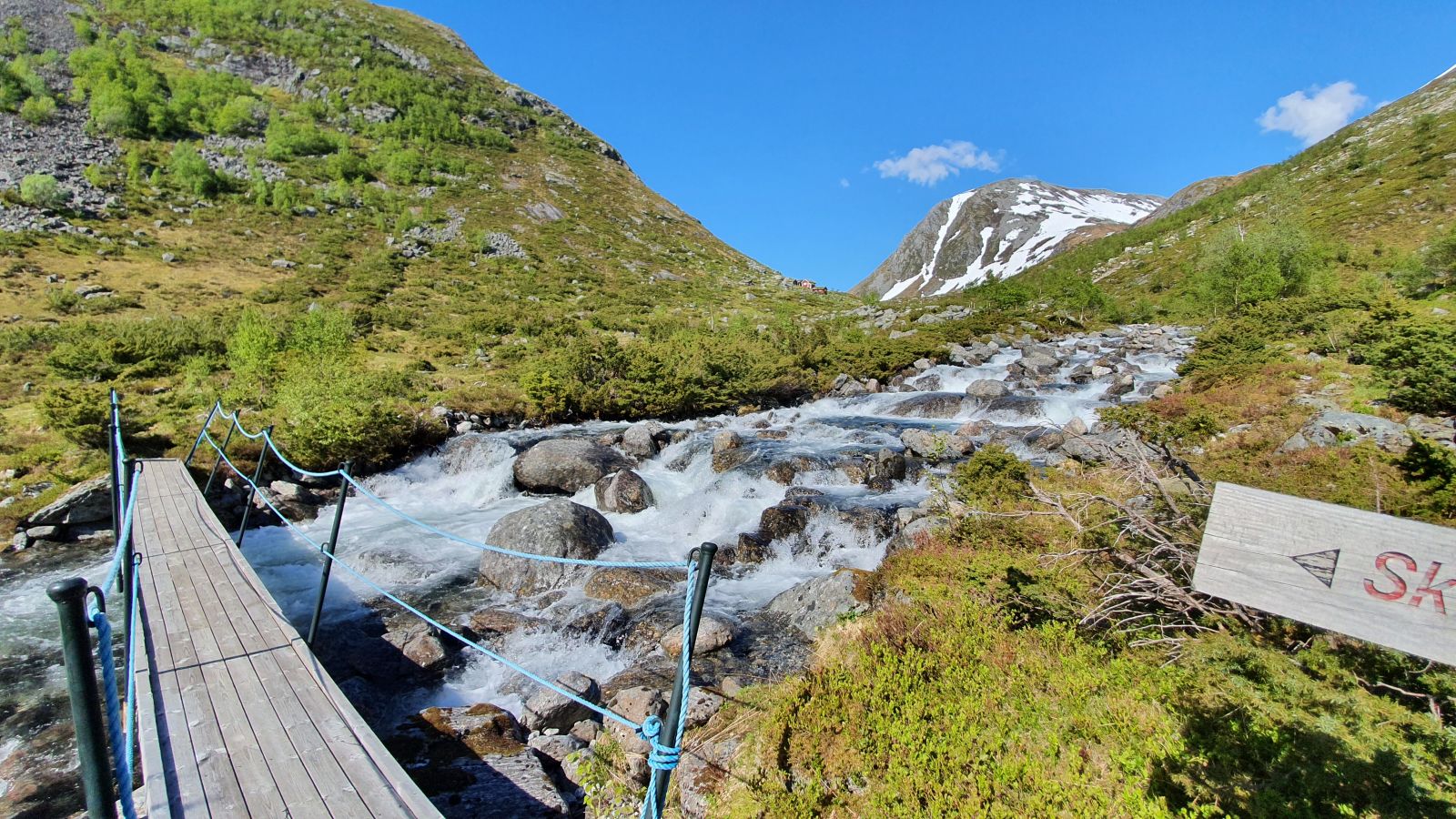 Omtrent 1km inn i dalen deler elva seg over stien, og det kan bli vanskelig å krysse ved høg vassføring. Det er mogleg å følge avstikkaren frå elva 10-15m og hoppe over. (Redigert 2024: trebruer plassert ut over dei vanskelege partia). Fortsett inn i dalen til du når brua over Skorgeelva, og du har setra i sikte. Her kan du også gå vidare inn i dalen og få utsikt mot Tverrfjellet, og til og med fortsette heilt til Årsetdalen på Vartdal.