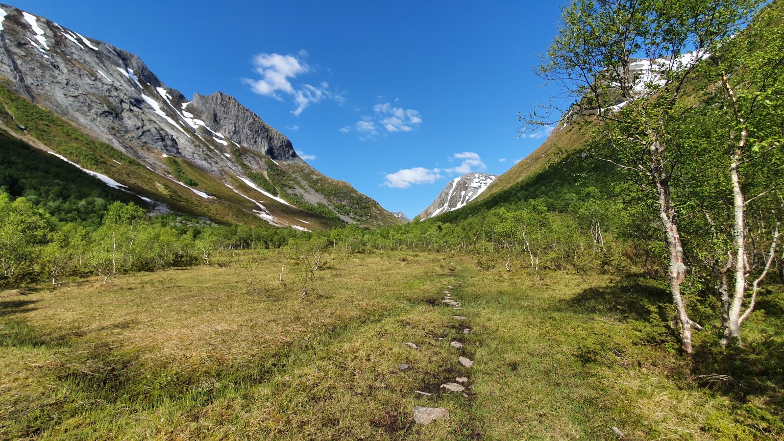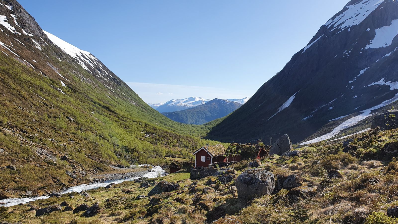 Stien splittar seg ned mot Sætre, du skal følge den til venstre. Når du kjem opp i dalen flatar det veldig ut, og du har rundt 2km igjen. Her kan det også være ganske vått, men det er lagt ut mange steinar der det er aktuelt.