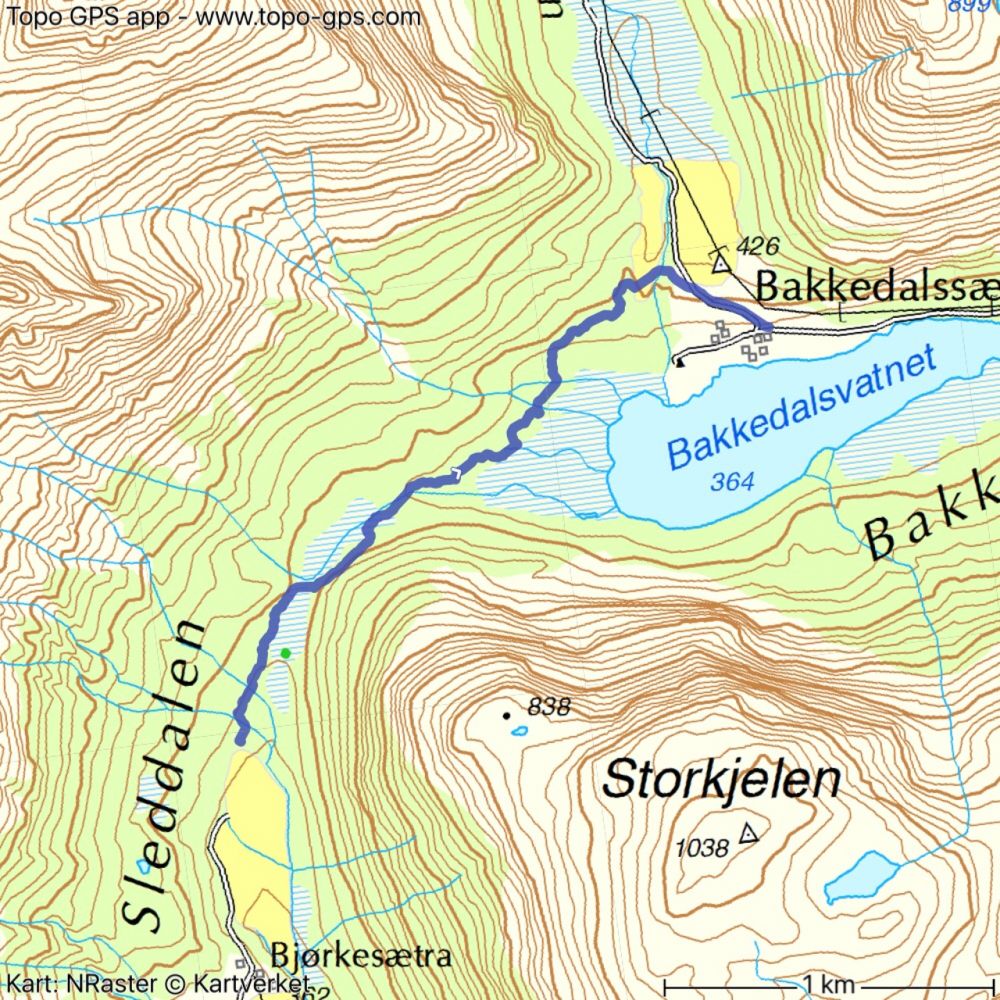 Dersom du vel å starte frå Bakkedalen og har parkert ved fellesfjøsen der, går du litt tilbake på bilvegen til du kjem til eit vegkryss der det er skilta mot Sledalen. Her går du nokre hundre meter oppover vegen og tek av mot Sledalen før du går over ei bru. Godt merka sti vidare mot Skjerva og Sledalen. Kan tidvis vere noko vått i råsa. Ikkje så langt frå Skjerva er det nokre furuer og ei av dei skal vere den såkalla Bjønnafurua. Det var i dette området den siste bjørnen i området vart skoten.