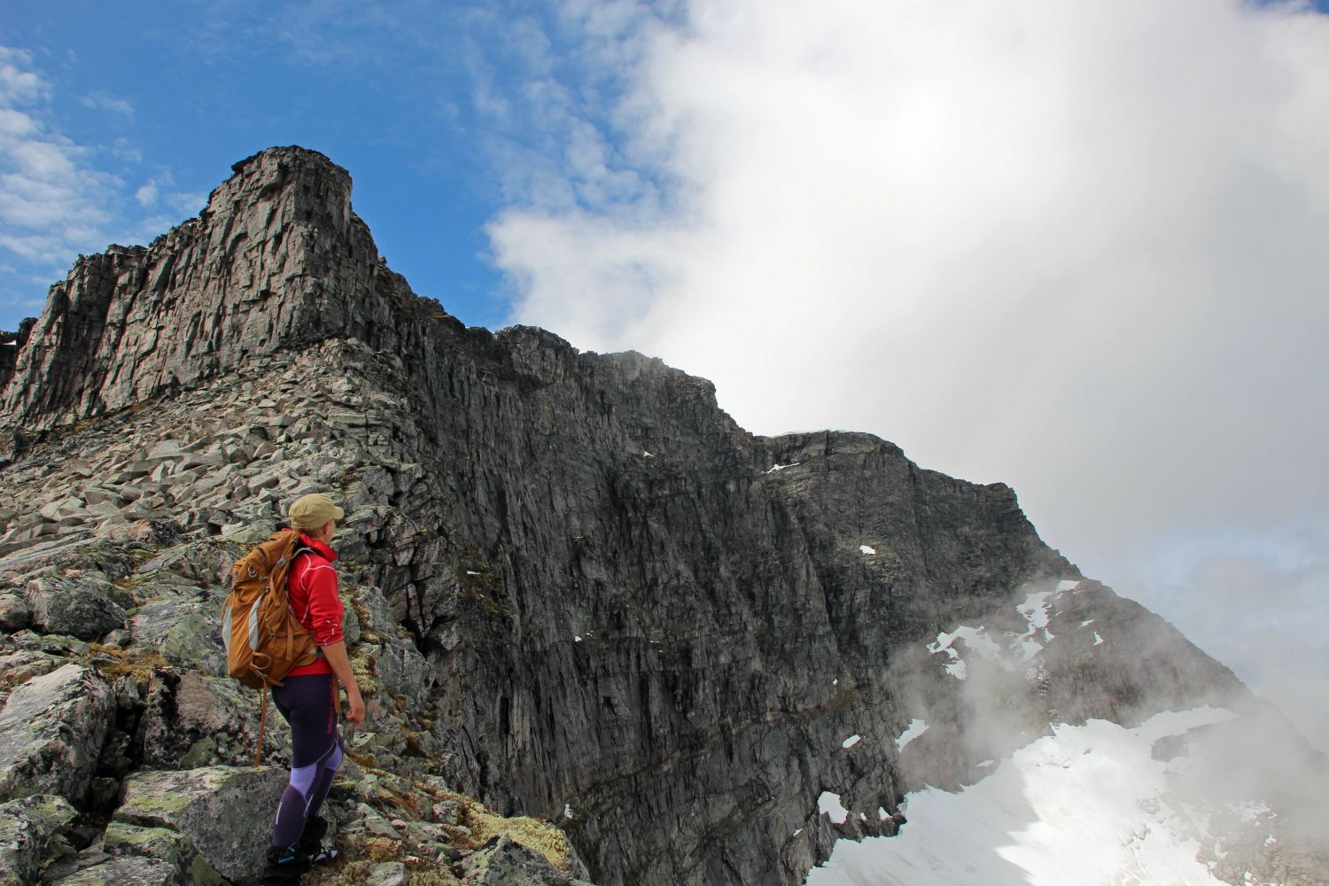 Fra Innerdalshytta følger du merket sti mot Todalen helt til du kommer opp i Bjøråskaret. Her tar du av fra stien og følger ryggen opp mot Snøfjellet. Følg ryggen helt til du møter bergveggen. Her går du helt oppunder berghamrene til du ser vardene som viser vei opp det bratteste partiet. Siste stykket mot toppen følger du terrenget helt til toppvarden. Vær obs på å se etter hvor du finner vardene til turen ned.