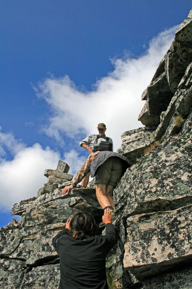 På vei opp er det et ganske bratt parti, men det er enklere enn det ser ut til på avstand. Det er tett med varder slik at du kan finne den enkleste veien opp den bratteste kneika.