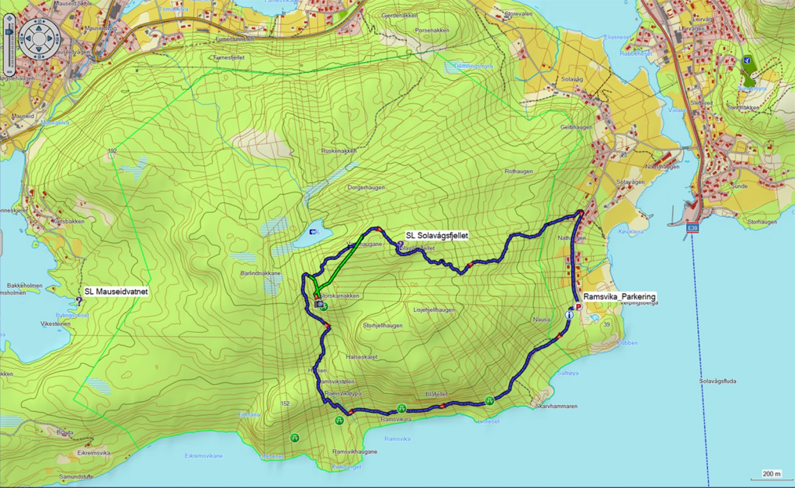Man kan ta buss til Solavågen fergekai. Gå noen meter tilbake over broa, følge veien forbi aldersboligen oppe i Pebakken. I krysset på toppen av bakken tar man så til venstre, og følger denne til enden. Her er skogsveien skiltet, på høyre side av veien. Denne ekstra turen er på ca. 1,5 kilometer hver vei, på asfalt.