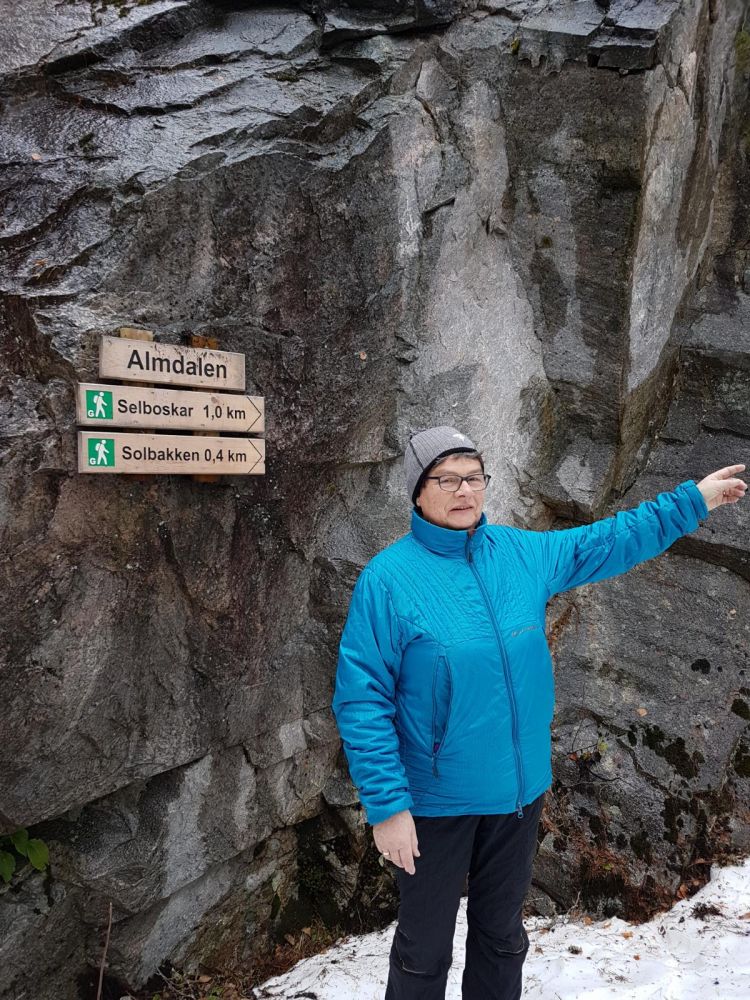 Derifrå går du den gamle bygdevegen gjennom skogen (ca 250 meter) til du kjem opp på asfaltert veg att. Følg bilvegen vidare oppover forbi to svingar. Rett etter andre svingen, i Almdalen, er det skilta til Selboskar og Solbakken på høgre sida av vegen. Følg skiltinga bratt oppover til Sætervegaskiftet (stidele, skilta) og ta av til høgre mot elva. Eit kort stykke etter at du har gått over brua dukkar Solbakken opp.