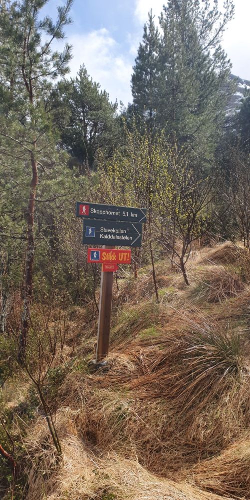 Frå parkeringsplass går du litt nedover grusvegen igjen og finn råsa/vegen mot Stavekollen ved skilt mot høgre.