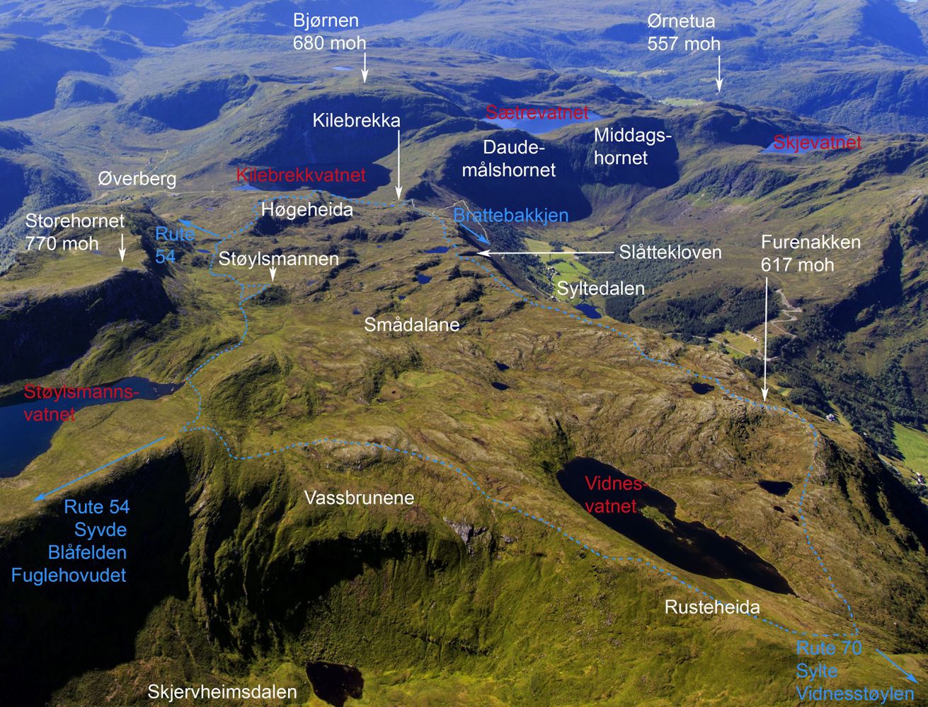 Frå startpunktet på Kilebrekka går ein på lett og fast underlag til Høgeheida og vidare til ein kjem til stikrysset på rute 54. http://mrfylke.no/Morotur/Turar/Syvde-OEverberg-rute-54 I stikrysset tek ein til venstre forbi Raudegrødvatnet. Om lag 100 meter etter vatnet står det ei trerot med hol i som mange har brukt til å ta innramma bilete av seg sjølv i. 400 meter etter denne rota kjem ein til Støylsmannen som har gitt namn til turen. Støylsmannen er ei flyttblokk som har kome med isen i istida. Truleg har den falle ned frå eit fjell og blitt liggande på isen. Då isen smelta på slutten av istida vart den tilfeldigvis plassert på høgkant på kanten av eit lite stup og står no trygt og stødig der den vart plassert for 10 000 – 12 000 år sidan. Støylsmannen står på eit lite høgdedrag litt til sides for den merka ruta, men bør vere grei å finne. Ruta på kartet og sporet på GPS-fila som du finn lenger nede på denne sida går innom Støylsmannen. Like etter at ein har passert osen på Støylsmannsvatnet når ein høgste punktet på turen 659 m.o.h. ved varden på Støylsmannsheida, og tek av til venstre nedover til Vidnesvatnet og vidare via Furenakken tilbake mot Kilebrekka. Det er flott utsikt frå Furenakken, og det same er det frå Slåttekloven der ein ser nesten loddrett ned til Syltedalen.