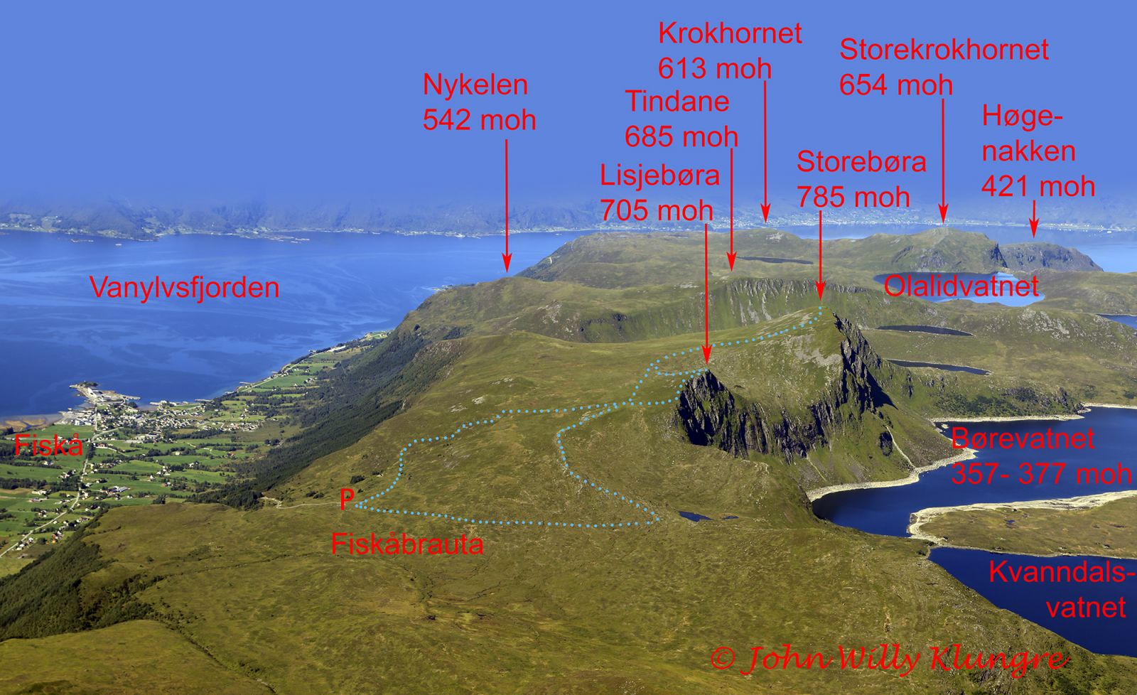 Turen startar på Fiskåbrauta, enklast er det å fylje skiltinga mot Storebøra, dvs du går mot vest opp forbi ei hytte og svingar mot nord opp forbi murane på Blåsenborg, ovapå Blåsenborg er der ein plass der lynet har slått ned 2 gongar dei siste åra, dette området ligg ca 100m vestapå råsa og er merka med eit stort lynskilt, råsa går vidare over myra i retning mot Lisjebøra, etter myra kjem du til eit vegkryss, der fyljer du skiltinga beint fram mot Lisjebøra og kjem opp på austsida og fyljer kanten opp til toppen, vis varsemd, bratt utføre her. Når du er komen opp går du ned på vestsida og kjem inn på råsa som går opp til Storebøra. Frå Storebøra går du råsa tilbake uten å gå om Lisjebøra, når du kjem til vegkrysset der du tok opp til Lisjebøra kan du enten gå råsa nedigjen til Fiskåbrauta eller du kan gå beint fram til ein stor varde og gå ryggen ned til Kvannskaret, når du er komen ned til Kvannskaret tek du til høgre og fyljer råsa forbi Kirkjesteinane ned til Fiskåbrauta, no har du fått ein fin rundtur forma som eit åttetal.