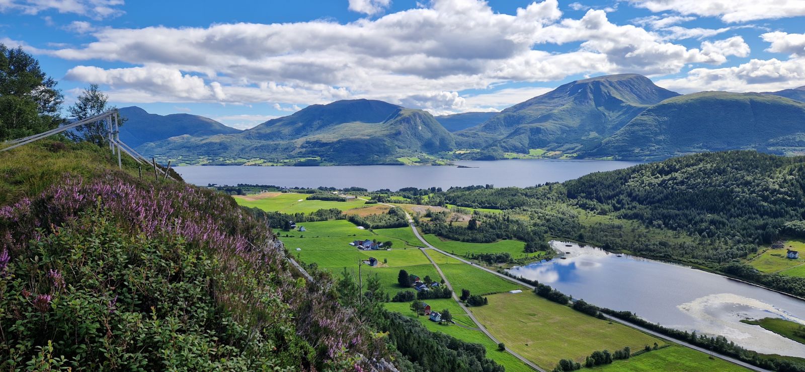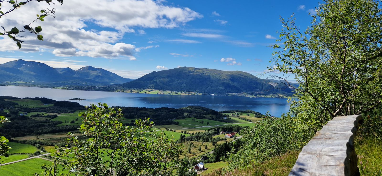 Turen går fra Helsetvannet gjennom kulturlandskap og frodig skogsli til et flott utsiktspunkt over Kornstadfjoden og fjellen på Eide