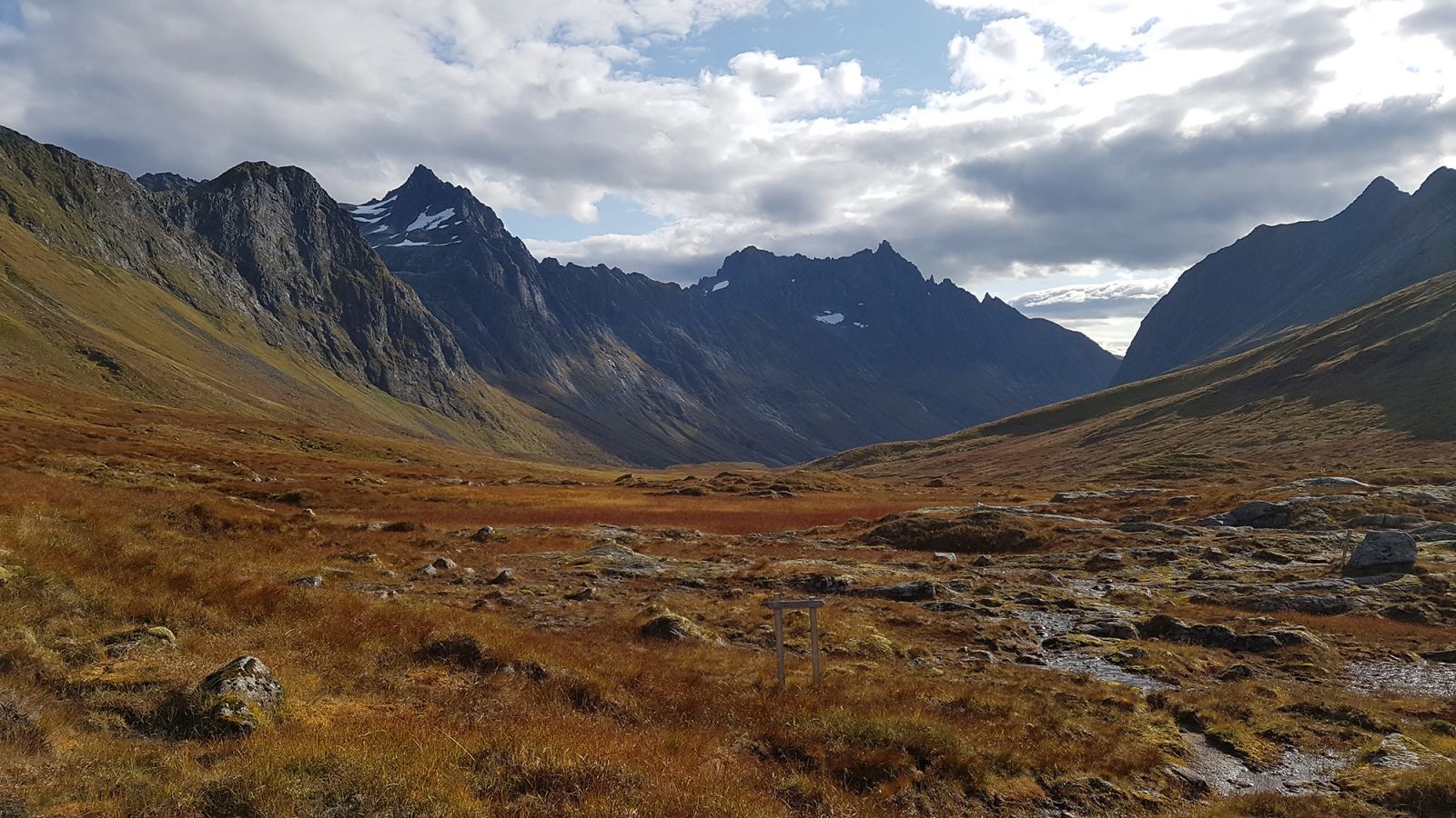 Stien blir nå utydelig. Innimellom kommer en over noe som ligner på sti, samt noen varder. Men dalføret nedover er relativt flatt, og ved å følge terrenget og holde høyde så lenge som mulig byr ikke denne delen på store problemer.