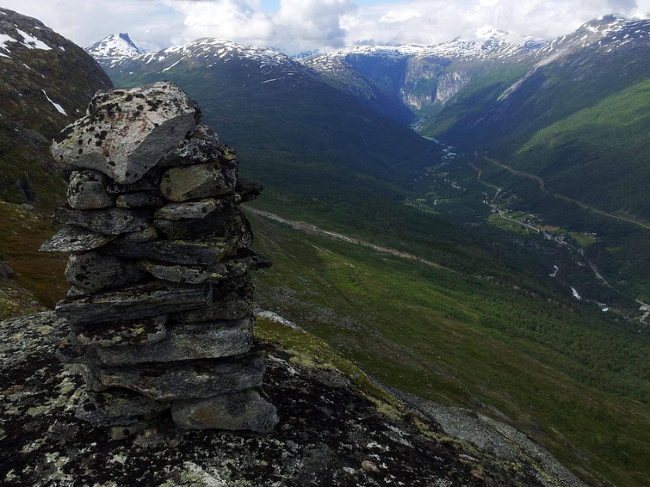 Ut mot kanten mot Romsdalen er det varder med et flott utkikkspunkt over øvre del av Romsdalen og opp mot Bjorli.