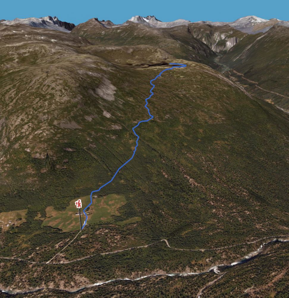 Herfra følg tydelig varding videre innover. Stien går først slakt i samme høyde før den krysser opp mellom noen sva. Etter dette er det lite stigning, der tydelig varding leder på skrå ut mot høyre og krysser etterhvert helt over mot Romsdalen og følger en rygg videre oppover. Så snart en ser vatna i Svabotnen, følg sti ned til elva. Kryss denne og følg til høyre for elva opp til vatnet.