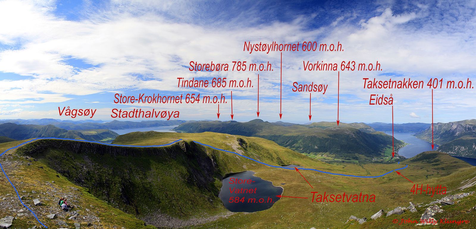 Ein startar turen ved å gå i retning Svartetua og 4H-hytta. Det er traktorveg/opparbeidd brei rås (sti) heilt opp til 4H-hytta. Etter dette er det jamt over bra tydeleg rås. Etter kvart kjem ein opp til dei to Taksetvatna. Råsa (stien) går på ein morenerygg mellom Lisjevatnet og Storevatnet. Lisjevatnet og Storevatnet ligg i kvar sin botn som er utgravd av botnbrear. Det er mange slike botnar i Vanylven og dei fleste av dei er nord- eller nordvest-vende. Botnen som Storevatnet ligg i er ein av dei største og flottaste botnane i Vanylven. Tyngste partiet er opp Storevass-skaret. Når ein kjem opp på kanten av fjellplatået er det fast og lettgått underlag fram til toppen av Svartetua.
