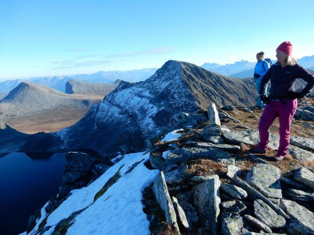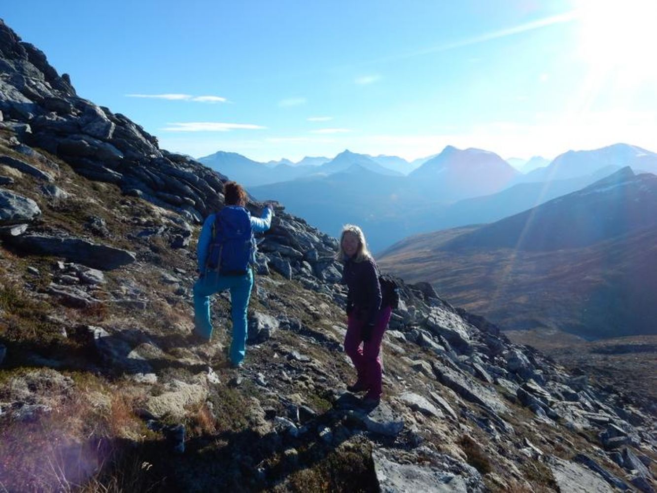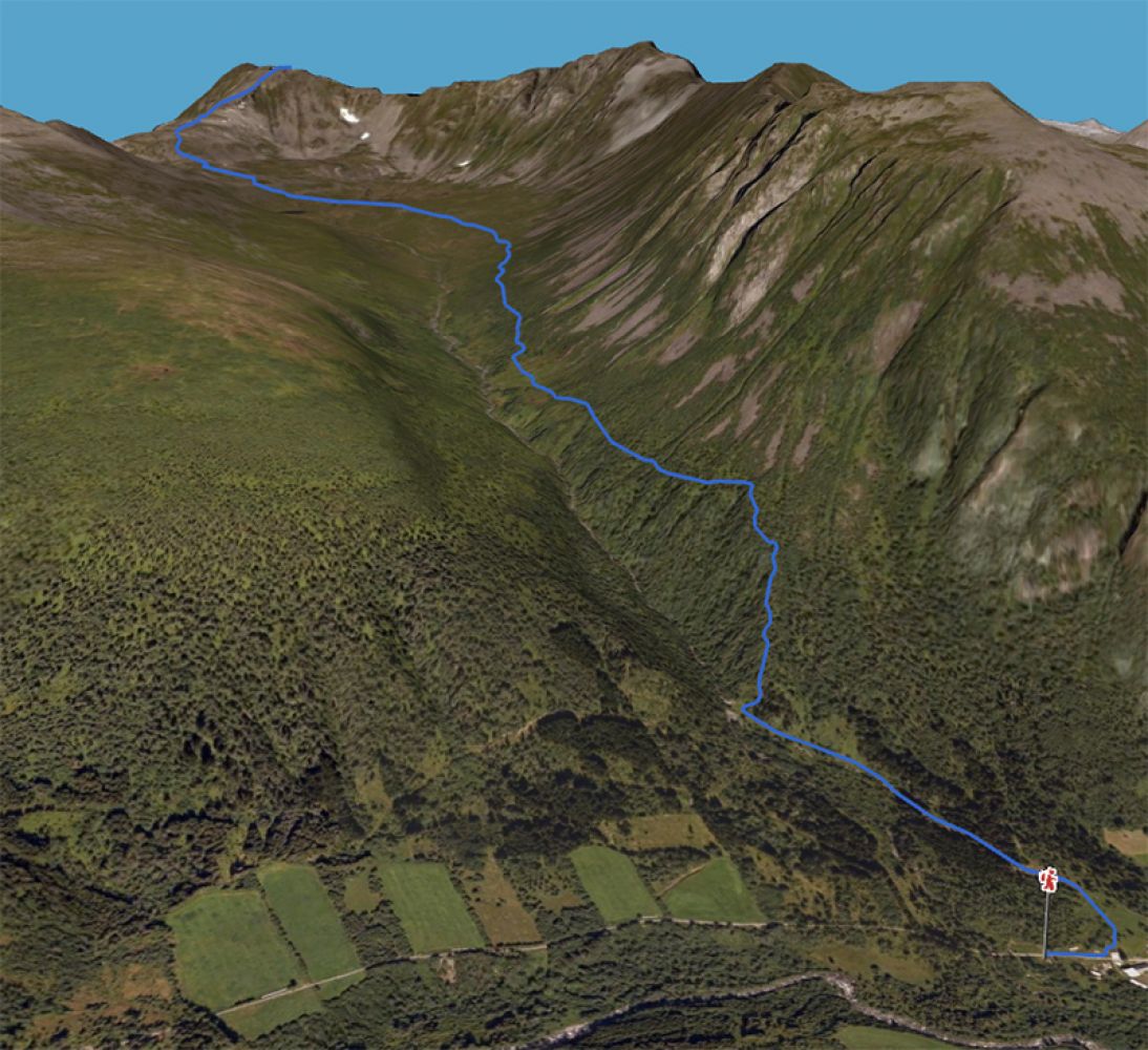 Ta av opp til høyre når vardingen fortsetter flatt innover til Venåsdalsskaret, og opp mot sydryggen som går ned til skaret. Følg ryggen oppover til toppen.