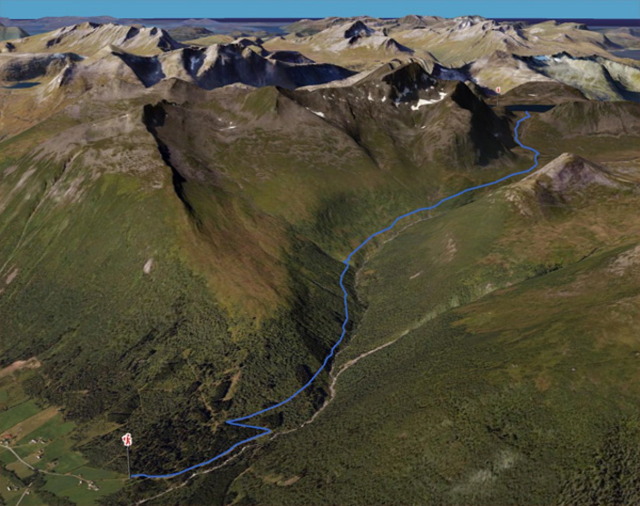 Fra Mosetra fortsetter stien innover dalen i venstre dalside. Halveis innover stiger den et stykke oppover, før den igjen går slakt innover. Stien runder etterhvert foten av Prosten og inn til venstre opp på en tydelig morenerygg. Herfra er det et stykke med litt bratt stigning opp Svartevassbakken, til venstre for elva og inn i botnen før vatnet. På flate krysser en elva og fortsetter på vardet sti inn til Svartevatnet.