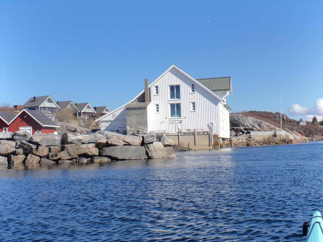 Ved høyvann er det mulig å padle inn i en smal passasje på baksiden av en lav øy og videre sørover mot bebyggelsen (se kartet i turbeskrivelsen). Her er det godt skjermet og lett å gå iland for å ta en matbit. Det kan være vanskelig å komme inn til denne passasjen fra nordvest når det er litt bølger fra vest, men man kan da padle selve sundet rett sørover istedet. Man kan gå opp innenfor den røde brygga her og ta turen oppom minnesmerket "Stille rom".