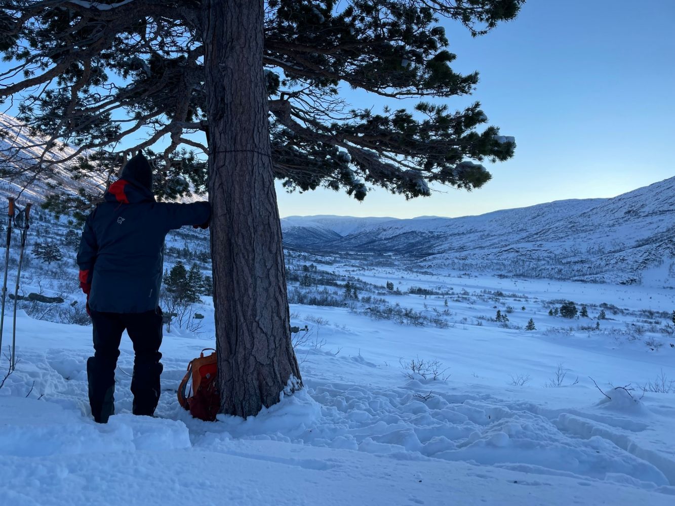Fra turparkeringen ved Vangshaugen følger du preparerte skiløyper innover Grødalen, underveis passerer du en gapahuk ved Storvatnet og en gapahuk ved Stortæla.Skisporene går i forholdsvis flatt terreng, er noe kupert og har noen lange slake bakker. Når du har passert gapahuken på Stortæla går du noen hundre meter for så å ta av ut av preparere skiløyper og følger sporet i kartet i denne turbeskrivelsen. Dette er ett spor som mange bruker når de går til Sviskora og Melseterkollen. Turen går noen hundre meter opp i lia. Turmålet ligger ved ei stor furu og her kan du ta en matrast og nyte den fine utsikten utover Grødalen. Samme spor tilbake til skiløypene og tilbake til turparkeringen.