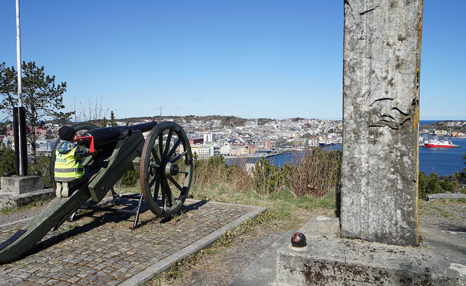 Når Sundbåten legger til på Innlandet, går du rett frem og krysser Fiskergata og fortsetter videre oppover Wasmuthbakken. Følg den og ta videre vei til venstre inn Skansveien. Der ser du skiltet til Bautaen. Grusvei helt opp til Bautaen og Kanon von Krogh.