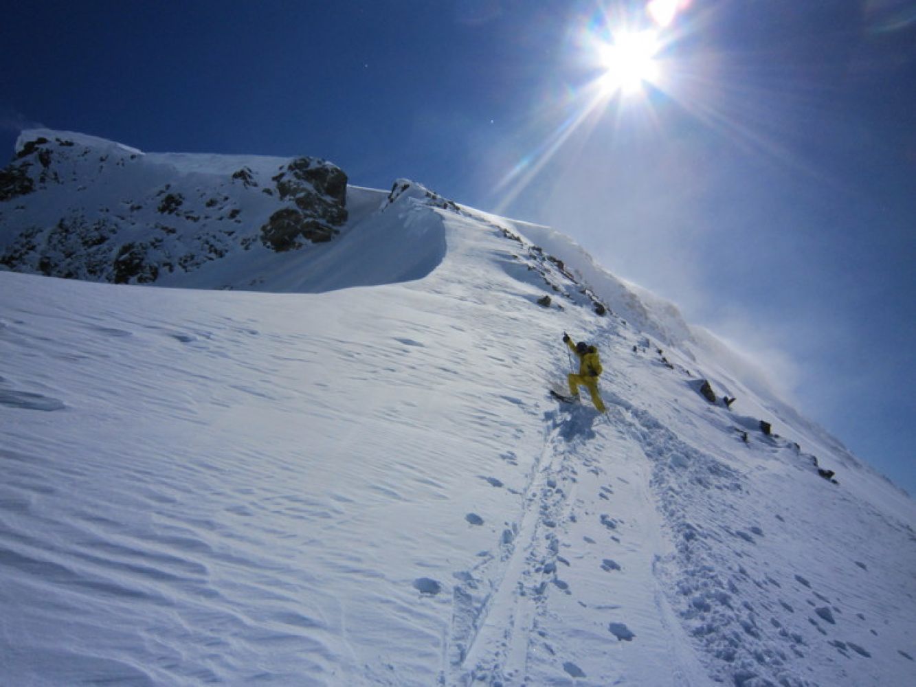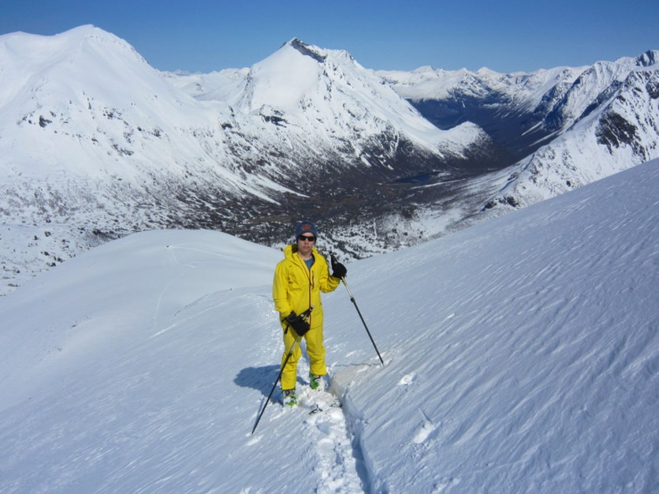 Har en med skiene til toppen er det en fin ryggtravers videre til Taskedalstind, ellers følger en samme rute ned igjen.