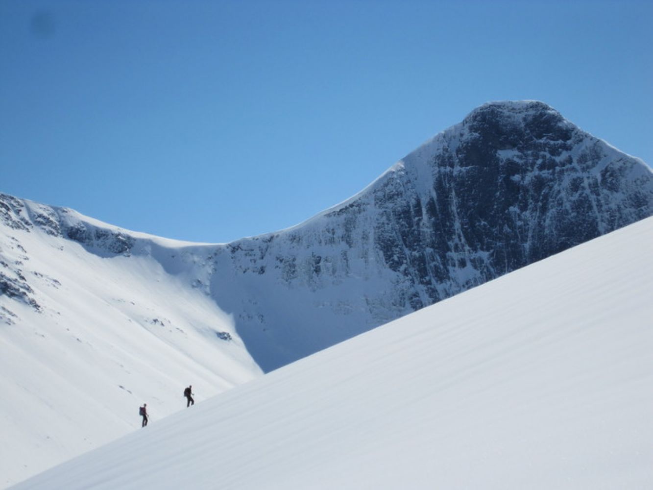Følg ryggen videre oppover mot venstre. Etter et slakt parti er det et kort bratt parti, der en må være oppmerksom på skavl til venstre, og holde godt til høyre for denne. Ryggen smalner gradvis av oppover til en når det siste bratte topppartiet. Her kan en sette igjen skiene om en ønsker det.