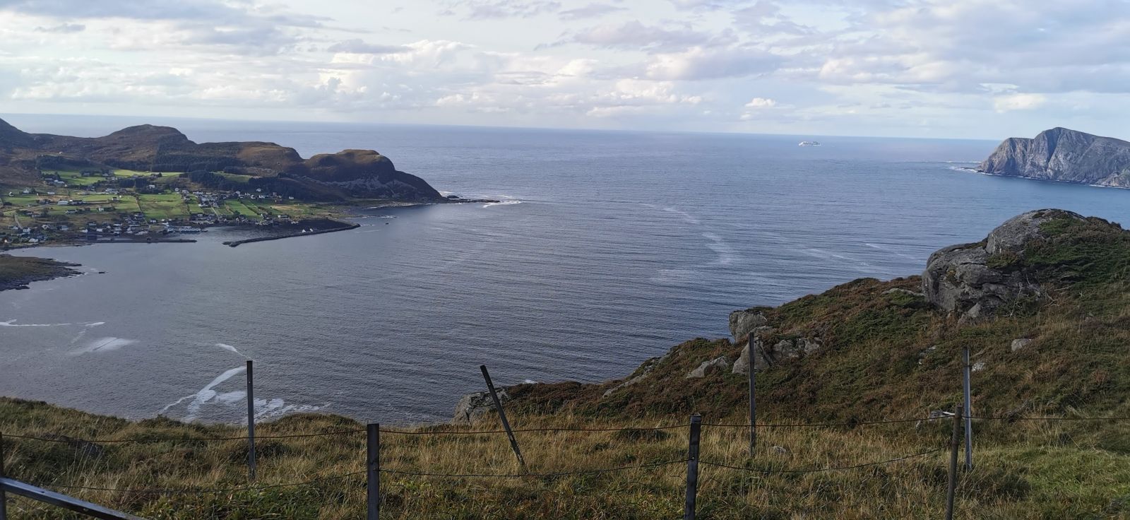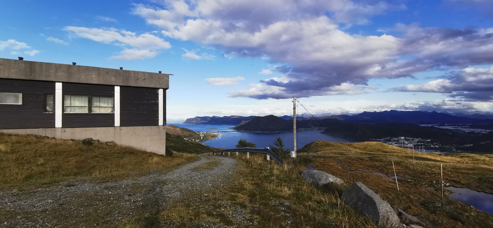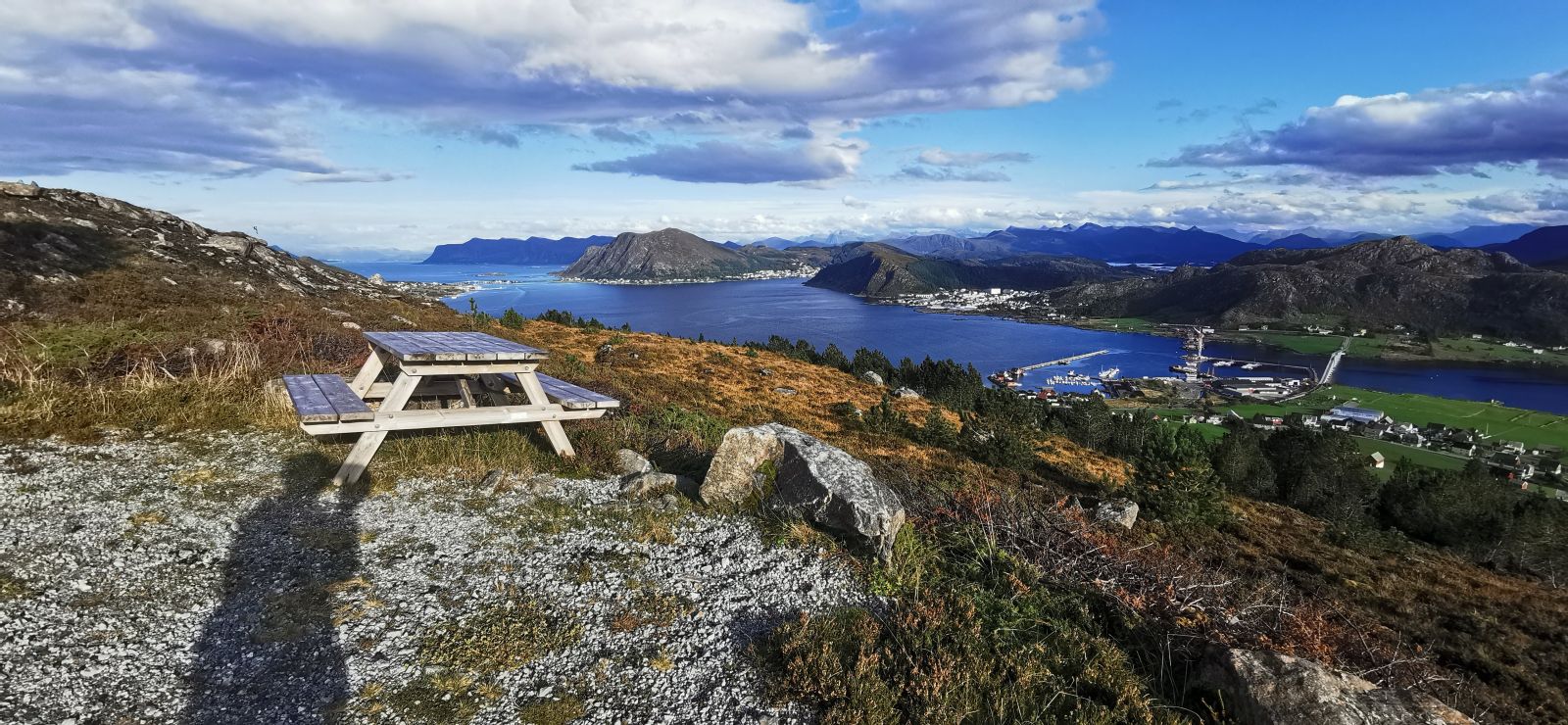 Flott utsikt på toppen! Langs vegen er det sett opp rastebord med flott utsikt innover mot sunnmørsalpane.