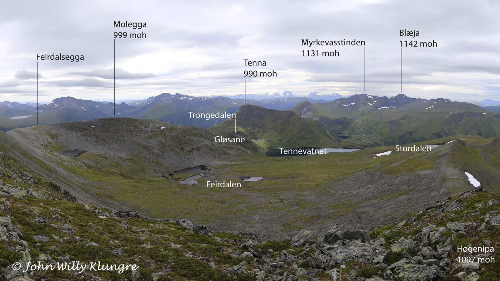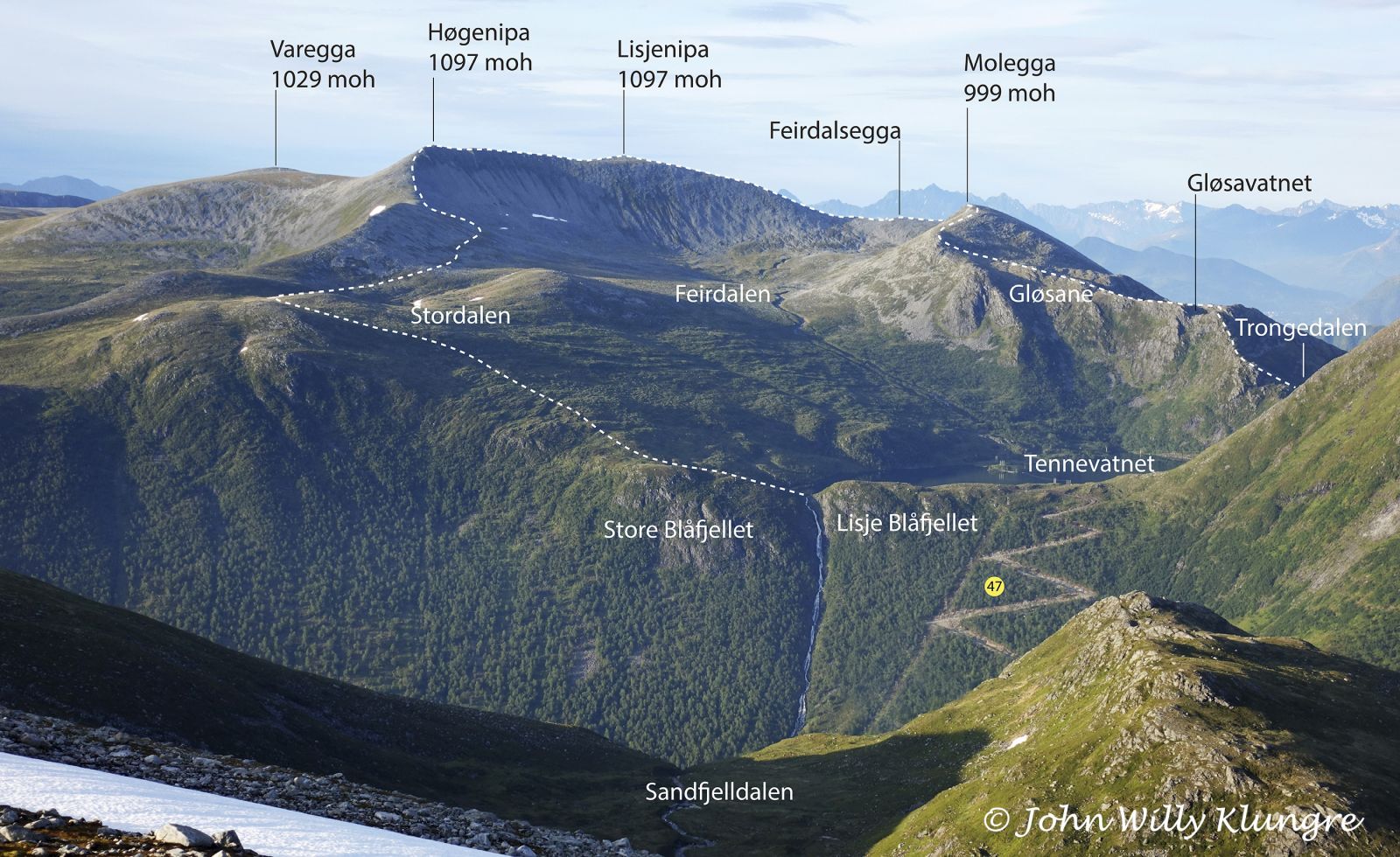 Vegen til Tennevatnet går i hårnålssvingar i det bratte terrenget og gir god trim. Det er ca 1300 meter får starten og opp til høgste punktet på vegen, og derifrå og bort til naustet på nordvestsida av vatnet er det ca 400 meter. Det er bratt veg heilt til topps, og der flatar vegen ut. Det er skilta mot Molegga, Hovlida og Høgenipa på toppen av traktorvegen. Det er ingen merka ruter vidare frå Tennevatnet, men ein rundtur via Høgenipa kan anbefalast. Frå osen ved Tennevatnet går det tydeleg rås eit stykke langs toppen av Store Blåfjellet og det kan vere ein god start i retning Høgenipa. Råsa til Trongdalen og vidare i retning Molegga finn ein lettast når ein kjem frå Trongedalen.