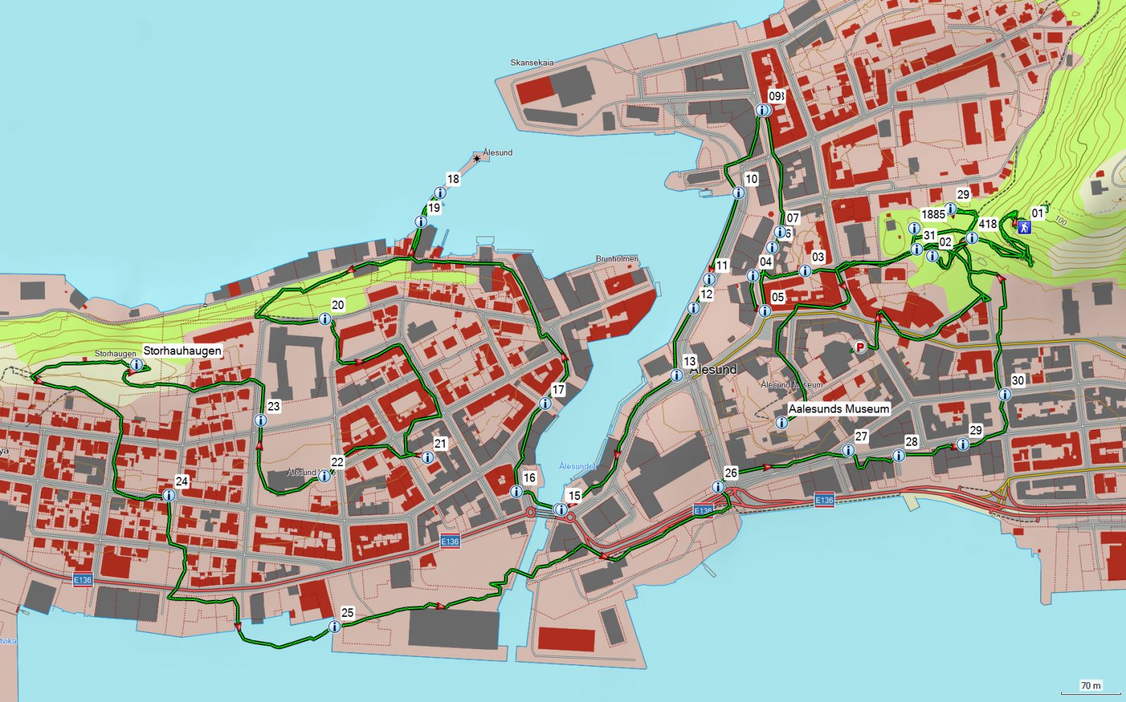 Følg denne til havnemoloen Molja og Jervelbua ved innløpet til havna i Ålesund. Videre langs Moloveien med Aspøyskolen (den gule, store bygninga) oppe på høyden til venstre, til murtrapper på venstre side opp til Brunholmgata. Til venstre på Brunholmgata og ny trapp til høyre etter ca 80 meter. Rett frem forbi parkkeringsplass og til venstre i Markvegen. I Hellegata tar du til høyre og går to kvartaler nedover før du på nytt tar til høyre inn på Øwregata. Du har nå Latinskolen på venstre hånd. Vi anbefaler en avstikker ned til venstre og inn på skoleplassen, for å se de spesielle frisene på fasaden.