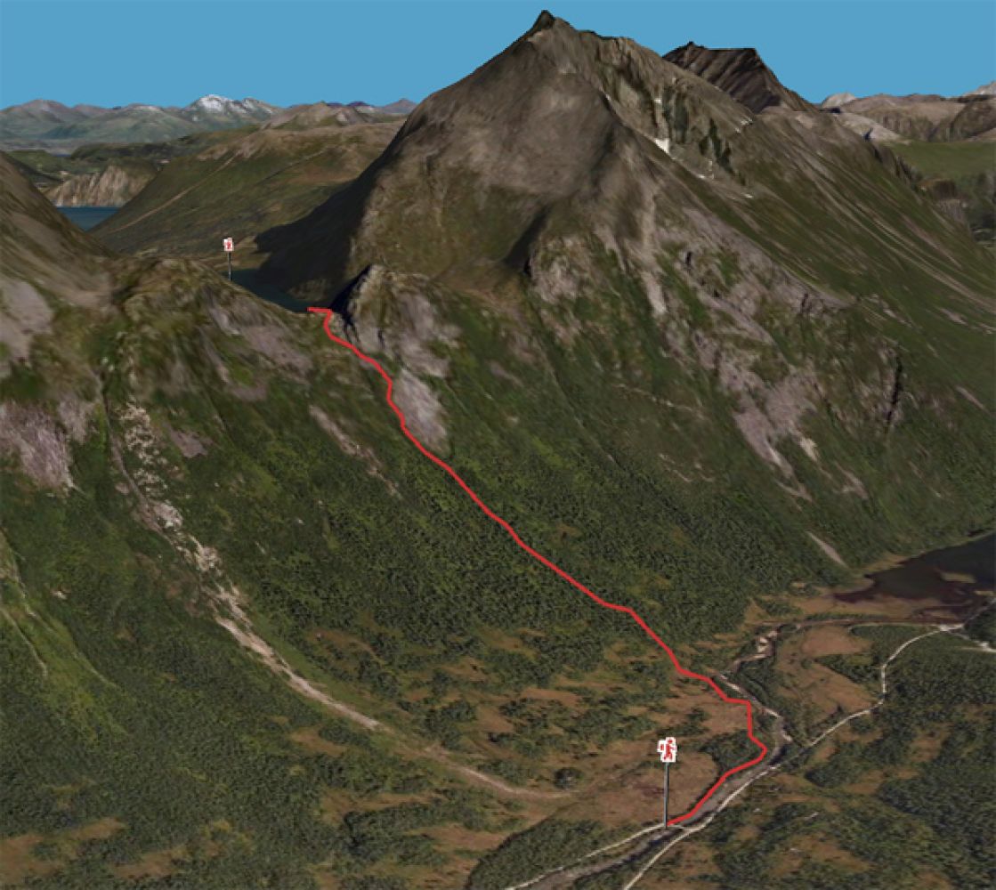 Stien begynner etterhvert å gå slakt oppover, men går snart over til bratt stigning. Følg svak ryggformasjon til høyre for elva oppover. Etterhvert kommer stien til et stort sva over skoggrensen. Ikke kryss over svaet, men følg venstrekanten av dette oppover til ei ur. Kryss over ura og følg flanken til venstre opp til skaret.
