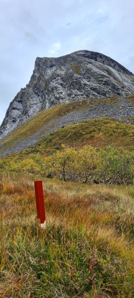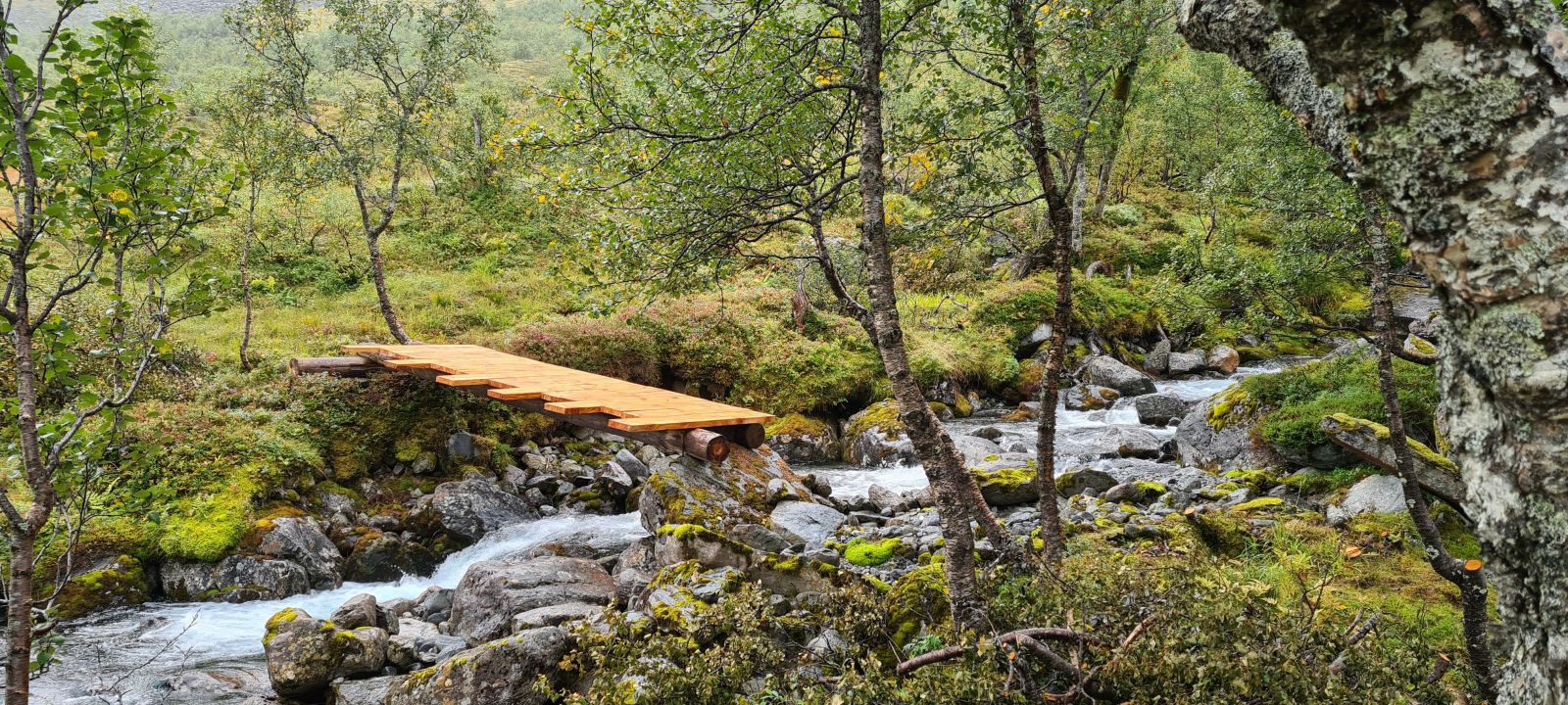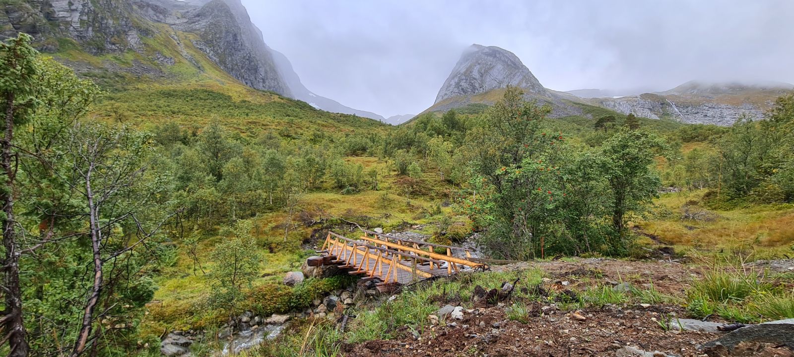 Startpunktet for turen er langs Laudalsvegen, sjå etter det grøne turskiltet. Stien vart rydda og merka i 2021 etter at bruene vart etablerte. Her er difor ikkje så tydeleg trakk enno, men her er godt merka og lett å finne fram.