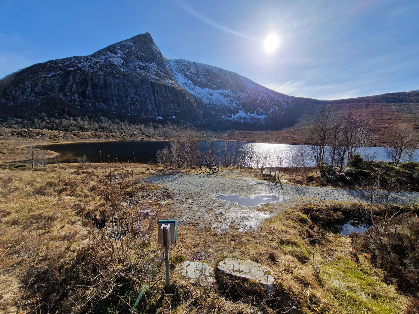 Følg grusvegen oppover til du kjem til ein bom. Denne går du forbi og passerer ganske snart også skyteområdet til Hildre og Brattvåg skyttarlag. Vegen går vidare i slakk stigning, men med nokre mindre brattare parti. Når du er ferdig med stigninga og vegen flatar ut, kjem du snart til Hildrevatnet. Her er det langgrunt i nordenen og fint å ta seg eit bad i på varme sommardagar.