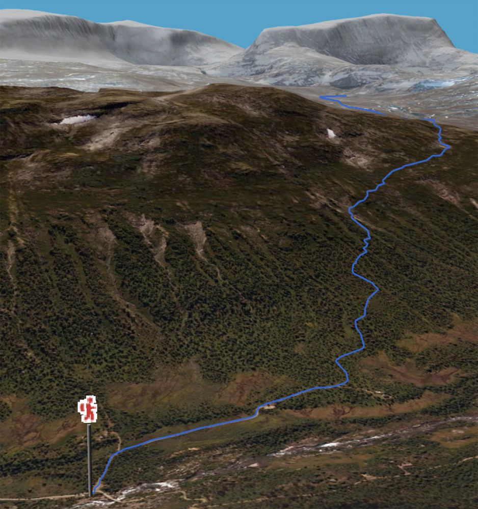 Like før skoggrensa følger stien ei renne oppover, og den verste stigninga er nå over. Stien fortsetter på skrå mot høyre til en kommer til en slak dal som leder videre innover til Trollbua. Stien er merket/vardet hele vegen.