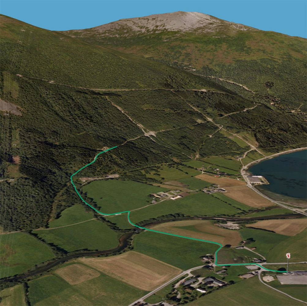 Kryss bygdeveien og gå ned ved rød løe. Følg vegen ned til elva og et stykke opp på den andre siden. Ta til venstre ved første vei, og deretter til høyre opp mot skogen.