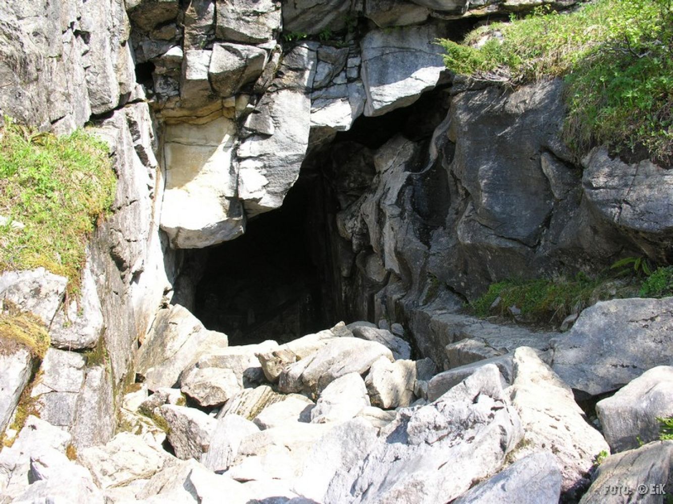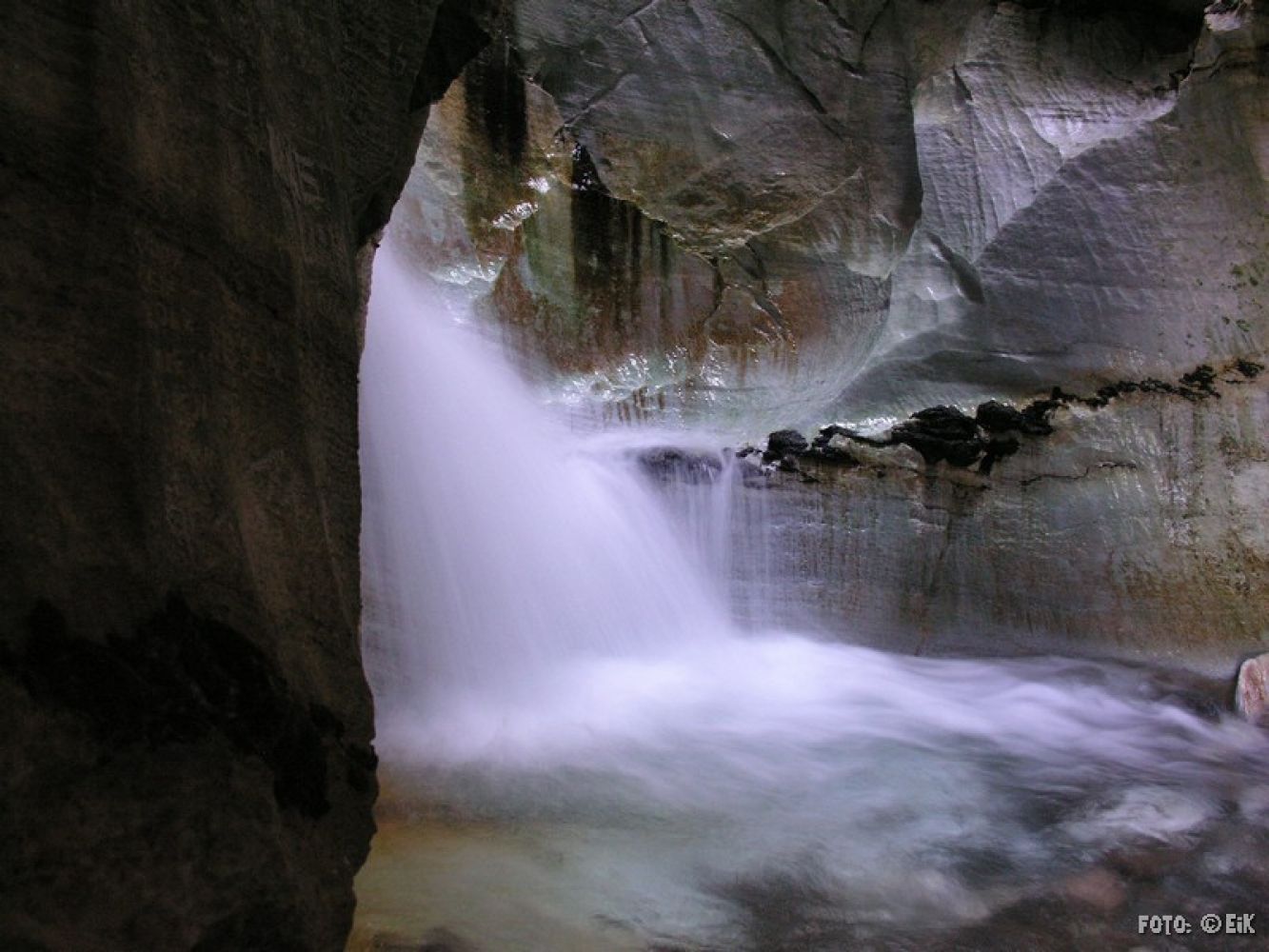 Etter ca 3 km kommer du til inngangen til den første grotta. Denne åpningen fører inn til en ca. 40 meter lang s-formet grottegang som ender i et flott fossefall i en større marmorgrotte. Du trenger lykt og aller helst hjelm for å gå inn denne grottegangen.