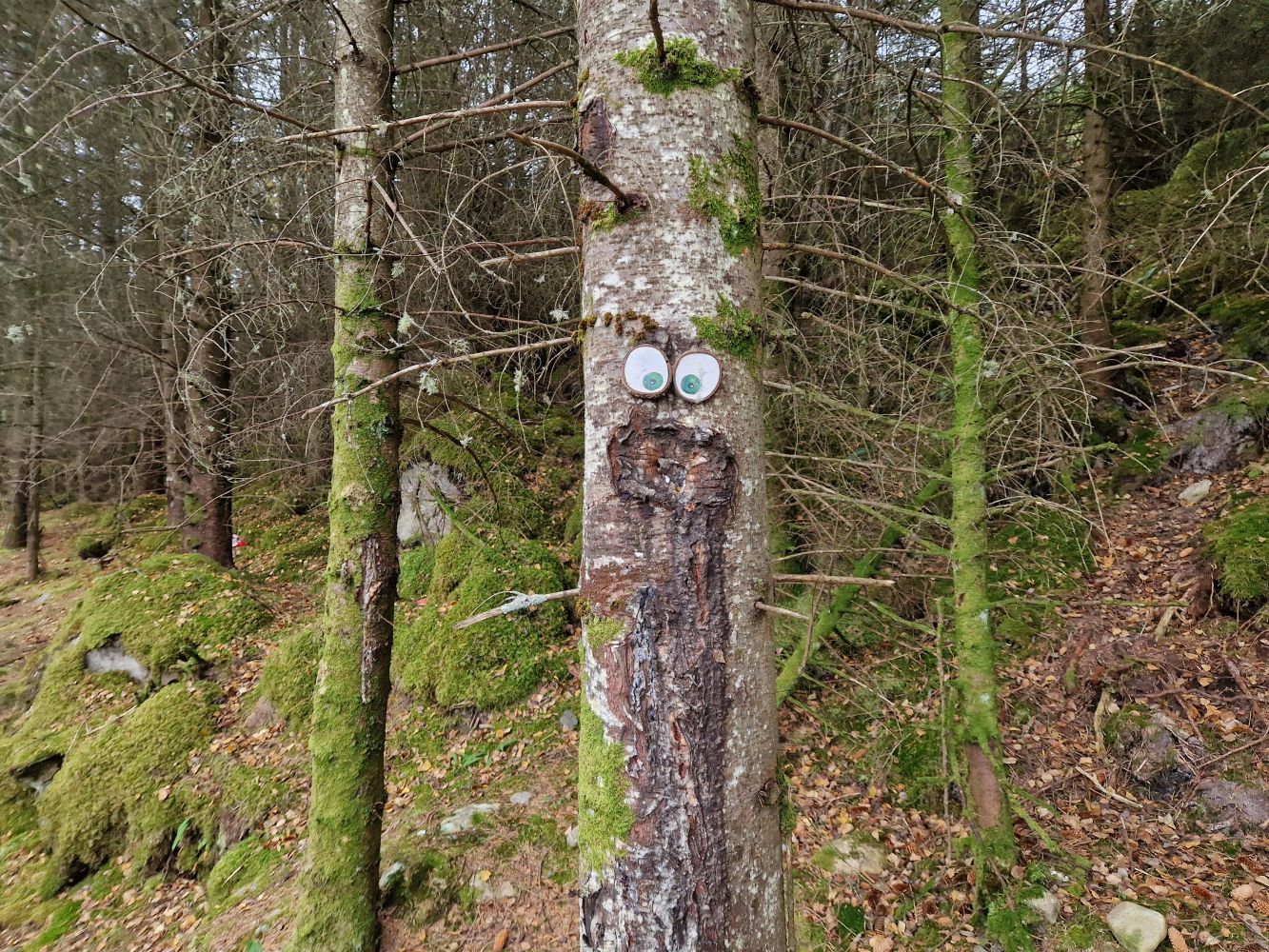 Med unntak av ein slakk bakke snor den idylliske grusvegen seg flatt bortover mellom skogkanten og busetnaden frå Hildre til Alvestad. Det er stort sett ope lende, men når ein nærmar seg Alvestad går ein gjennom ein tett granskog med ein mosegrodd steinkant langs med. Her må du sjå godt etter! Langs steinkanten kan du finne steinar som det er måla oppmuntrande og fine ord på, eller du kan finne knallraude fluesoppar, troll, marihøner og andre spennande ting. Kanskje oppdagar du også trea med auger som følgjer med deg når du går forbi?