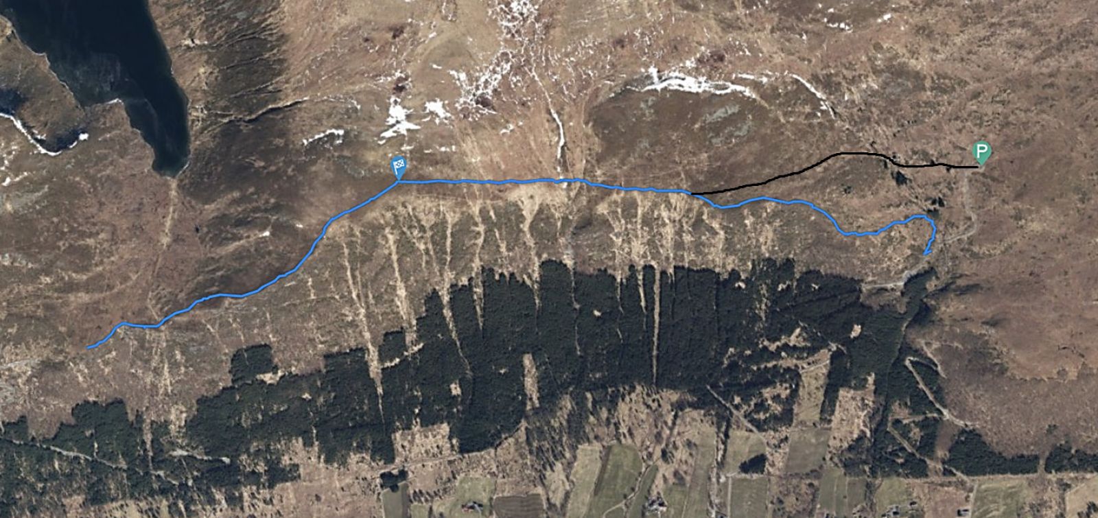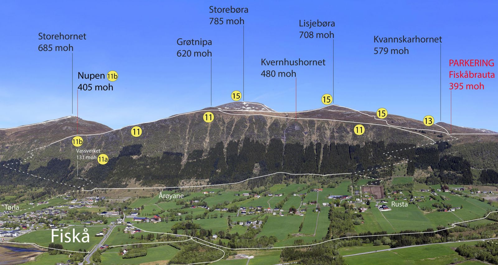 Ruta som kartet viser tek utgangspunkt i start litt nedanfor parkeringsplassen på Fiskåbrauta og turslutt på Nupen. GPS-fila som du kan laste ned om du vil har same utgangspunkt og slutt. Parkerer du på Fiskåbrauta kan du følge svart strek på bilete inn på gps-sporet.