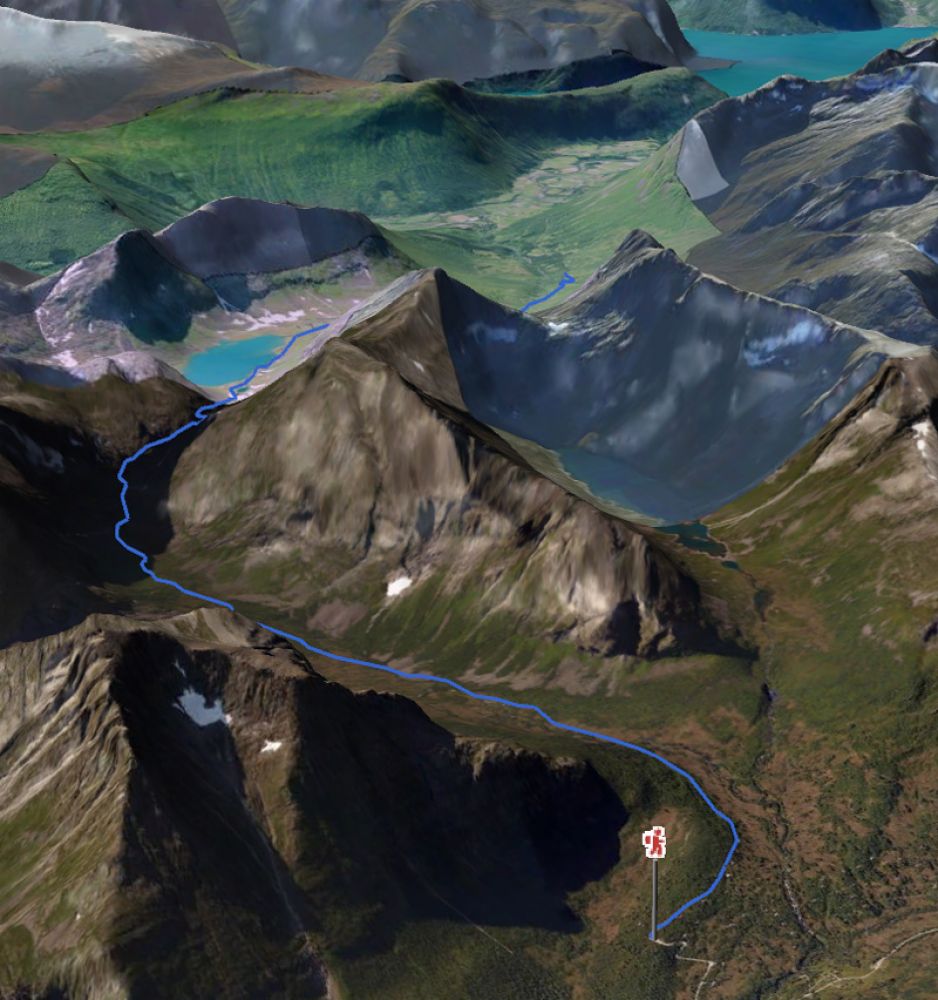 Stien følger over myrene i venstre dalside av Grønfonnbotnen, noen våte partier før den går over på tørrere terreng. Følg stien helt inn i botnen, og inn til en markert rygg som leder oppover. Følg denne et par hundre meter opp, og kryss deretter til høyre inn i ura..