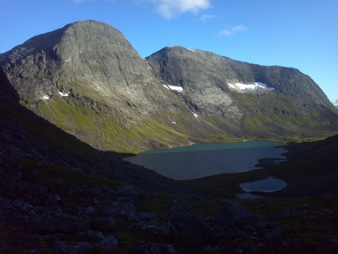 Følg deretter ura oppover botnen mot strupen på gradvis grovere ur. Kort bratt parti øverst, der en kan gå enten rett på skaret eller runde forbi opp til høyre.