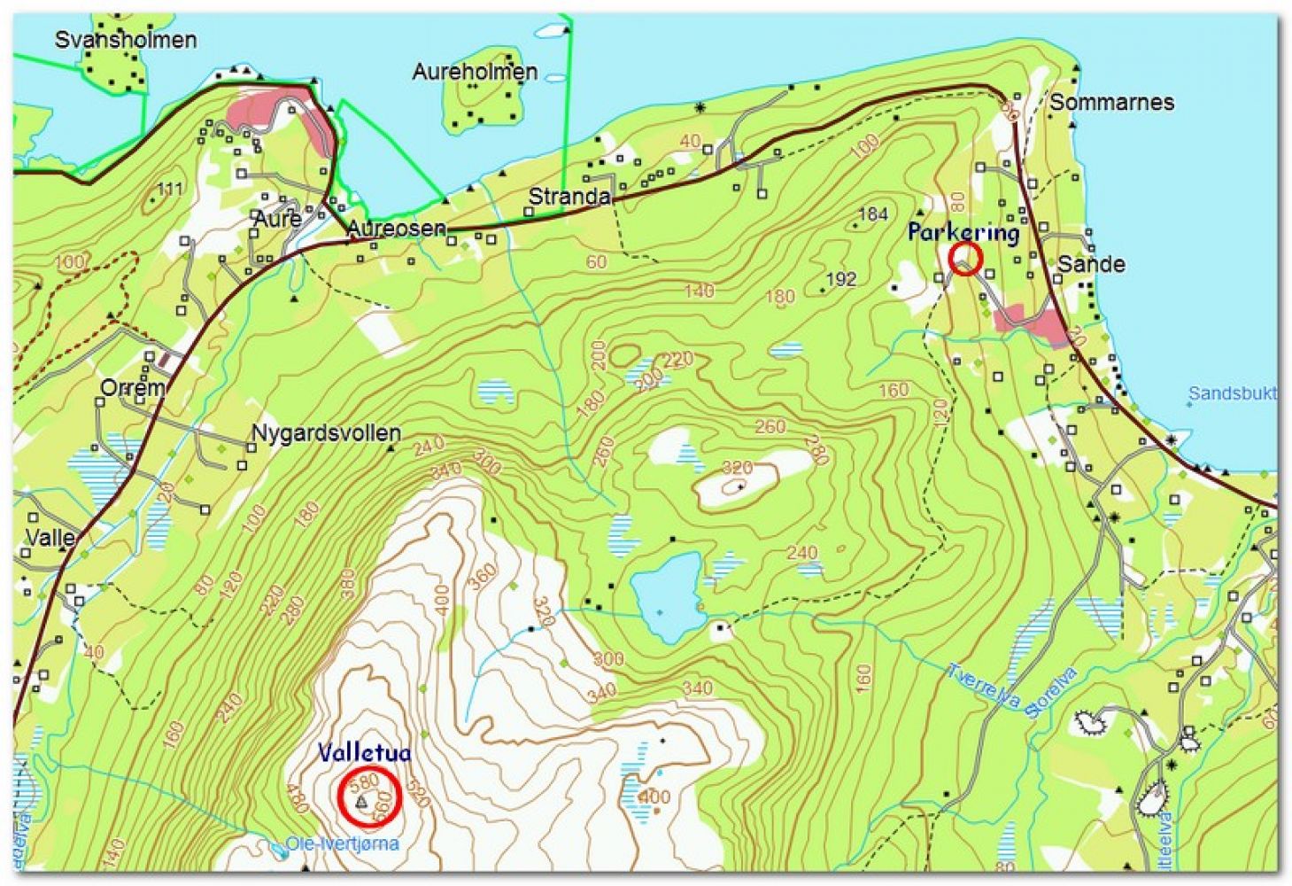 Til toppen av Valletua. Ligger rett sør for Jendemsfjellet. Flott utsikt mot havet og store deler av Fræna og nabokommunene. Flere stier opp. Vi foreslår den fra Sandsbukta. Kjør opp gjennom boligfeltet, ta av like ved et betong-busskur, oppover. Følg gardsveien gjennom det først tunet og videre opp lia. Gjennom ei grind (klive over?) Like før vatnet, krysser du bekken over ei steinhelle, opp til ei hytte. Hold mot venstre fra hytta og følg stien langs ryggen. Du kommer opp på flatene sør for Valletua og når toppen fra sør mot nord.