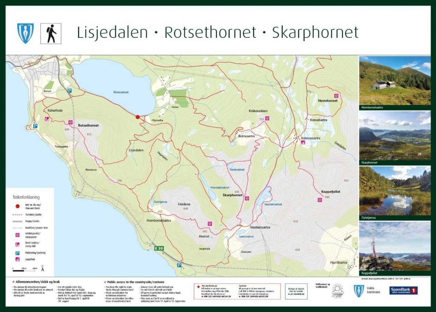 Frå parkeringa følger du vegen vidare langs Rotevatnet. Når du kjem til ein granskog etter ca. 0,8 km, kan du ta stien gjennom skogen. Ev. kan du følge vegen 150 m til, til du kjem til ei turtavle/skilt. Ta av på skogsvegen skilta mot m.a. Skarphornet. Følg skogsveg om lag 1,5 km, og så skilting til Skarphornet. Følg merka sti heilt til du kjem opp til Vardevatnet, ca 1,6 km. Ved punkt (N62° 07.491' E6° 09.602'), 580 moh., skal du følge stien vidare rett fram og opp til Vardeheida (skilta). Stien er sporadisk merka med raude merkepinnar.