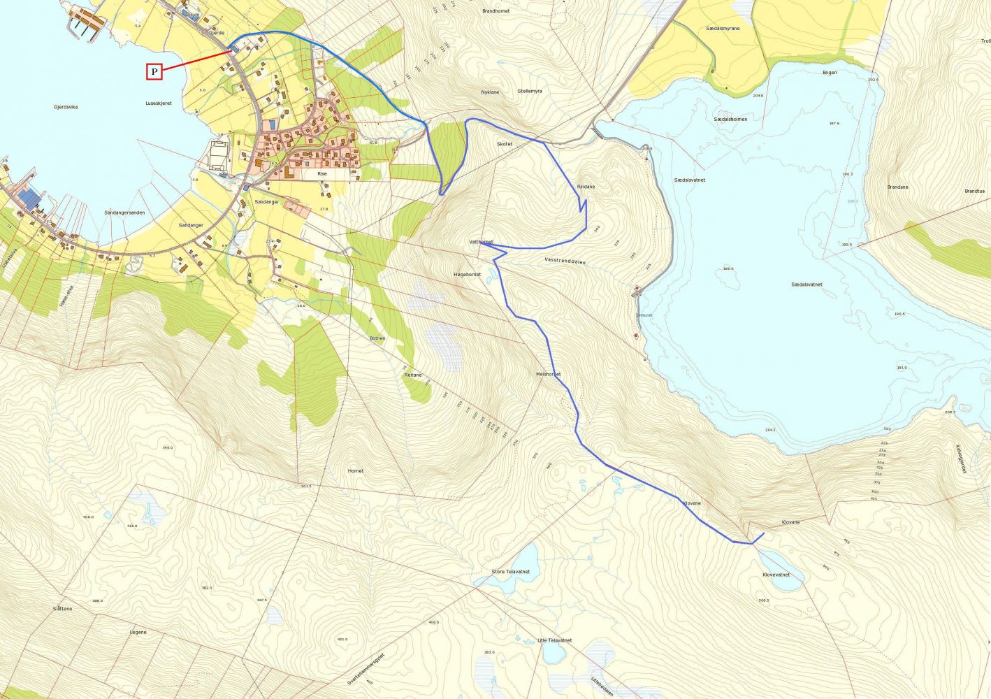 Følg bilvei mot Sædalen. Når ein kjem forbi Skotet og opp på første strekk med flat vei, ta til høgre før brua og gå mot søraust ( Rindane ). Hold vest for denne fjell-knausen. Følg merkepinnane til toppen av Vatthornet 335 moh. her har Fjelltrimmen ved Gjerdsvika IL ein av postane sine. Frå Vatthornet går turen vidare sørover og innover fjella til Klovevatnet 505 moh. Her er litt variert terreng, men fint å gå om ein nyttar fellar på skia.
