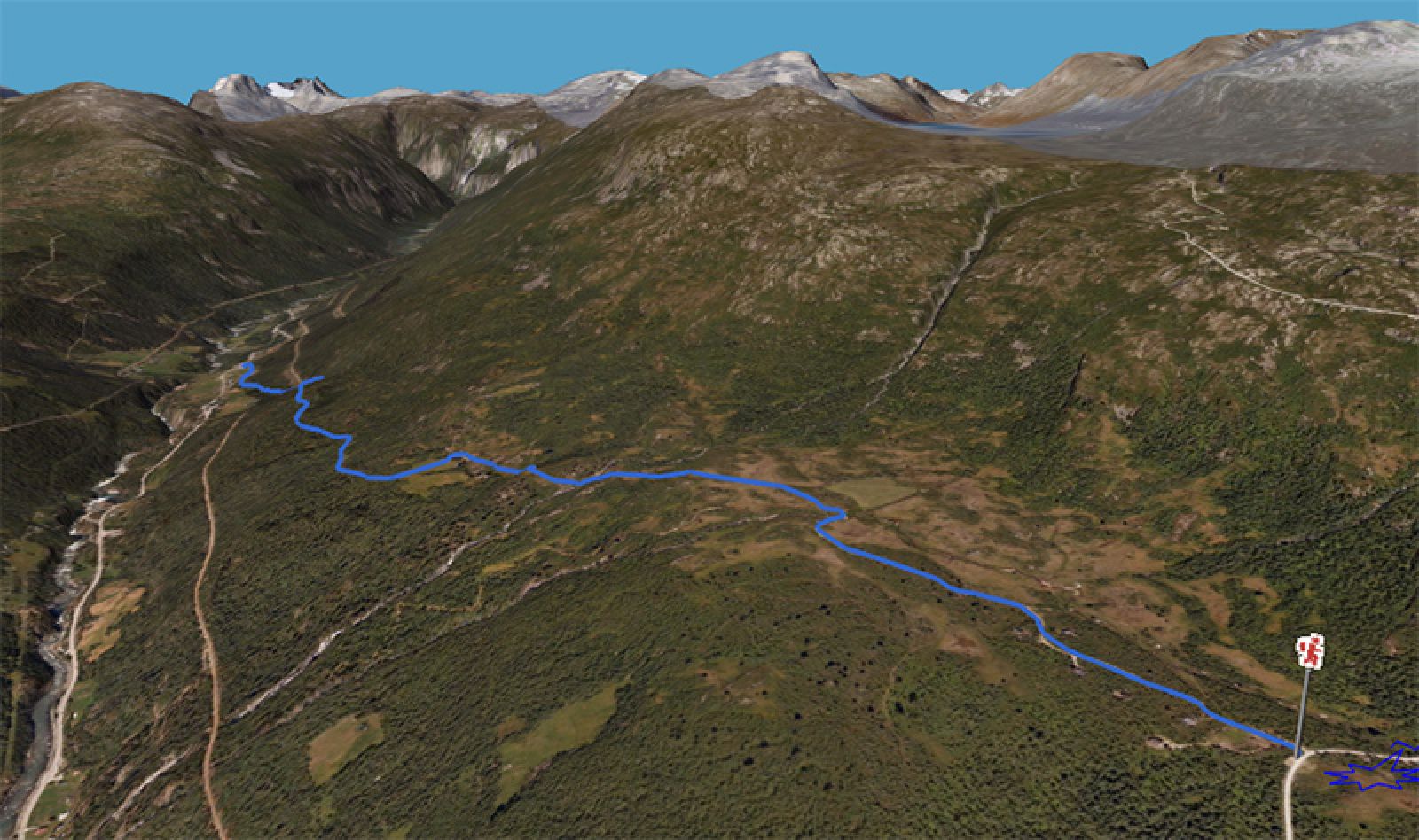 I enden av myra ta av på sti ned til venstre og kryss nedover til en møter elva. Følg denne litt nedover og kryss over på bru. Følg stien videre og ta ned bakke mot setrene. I bunn av bakken kryss over myr og hold høyden bortover til stikrysset over Rødstølsetra.