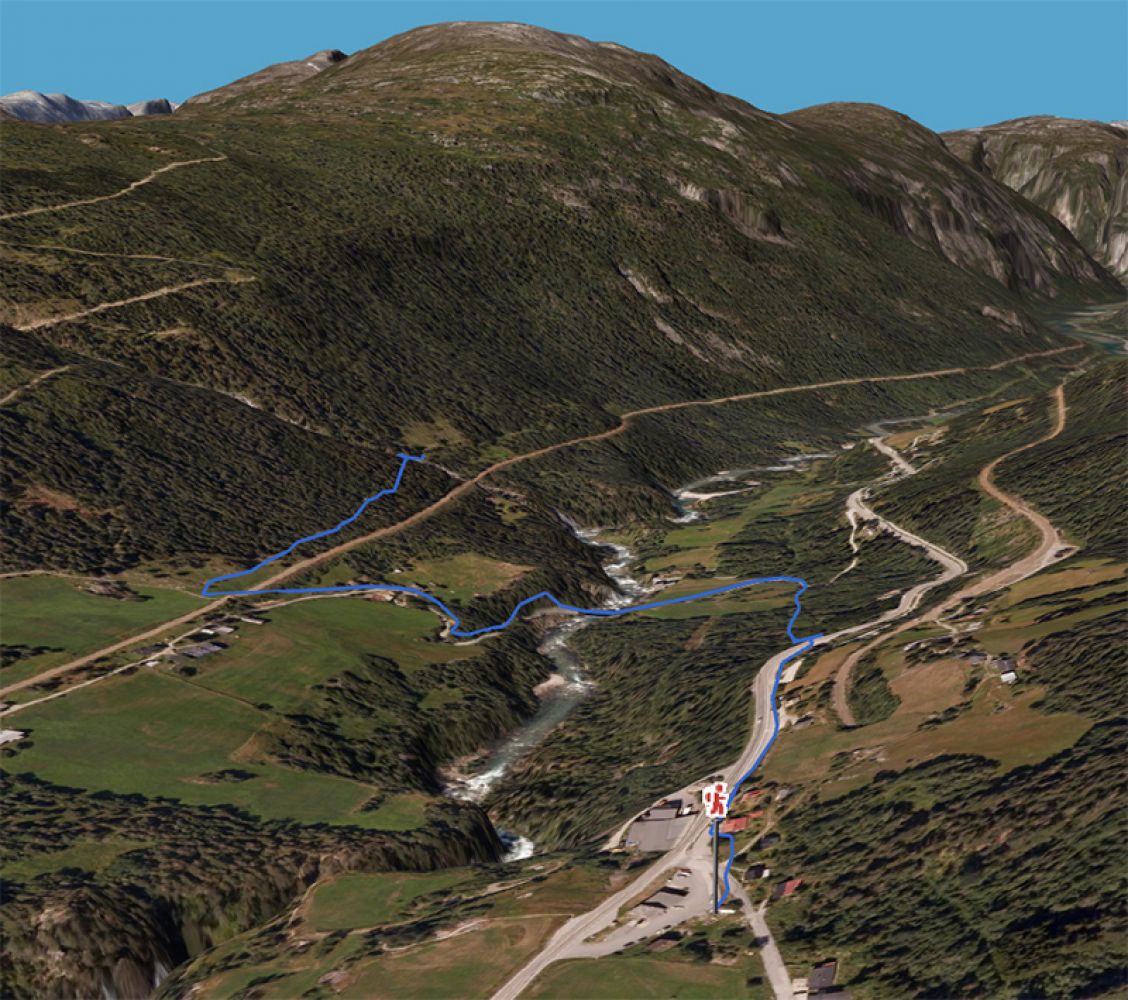 Følg gang- og sykkelveien nedover langs E136 til ca 50 m nedenfor stasjonsveien (det står skilt stasjonsveien). Kryss over E136 og ta den gamle veien gjennom Romsdalen nedover på andre sida. I første kryss, ta til venstre, i neste kryss, ta til høgre. Veien kommer ut på asfaltert vei til Sletta. Ta til venstre i første kryss.