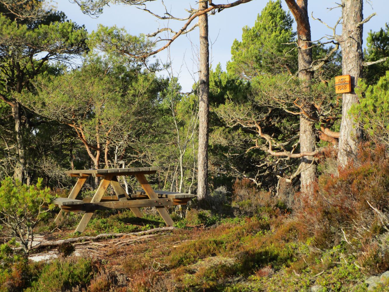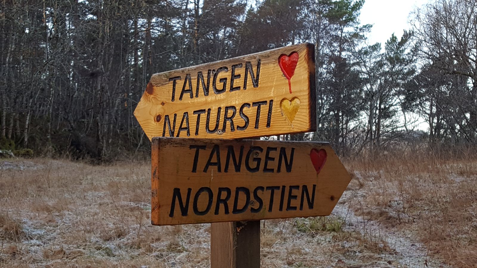 Stien går videre vestover langs fjæra. Etter hvert går stien inn i skogen og møter da hovedstien til Hjertøytangen. Gå et par hundre meter lenger vestover. Der møter du «Pers plass», et veiskille. Der har du valget mellom å gå til Hjertøytangen eller gå tilbake til båten eller Hjertøyplassen/Gulhuset. Velger du å gå tilbake, gå ned berget mot fjorden, og følg stien tilbake mot båten eller Hjertøyplassen. Turen kan selvfølgelig gjøres andre vegen.
