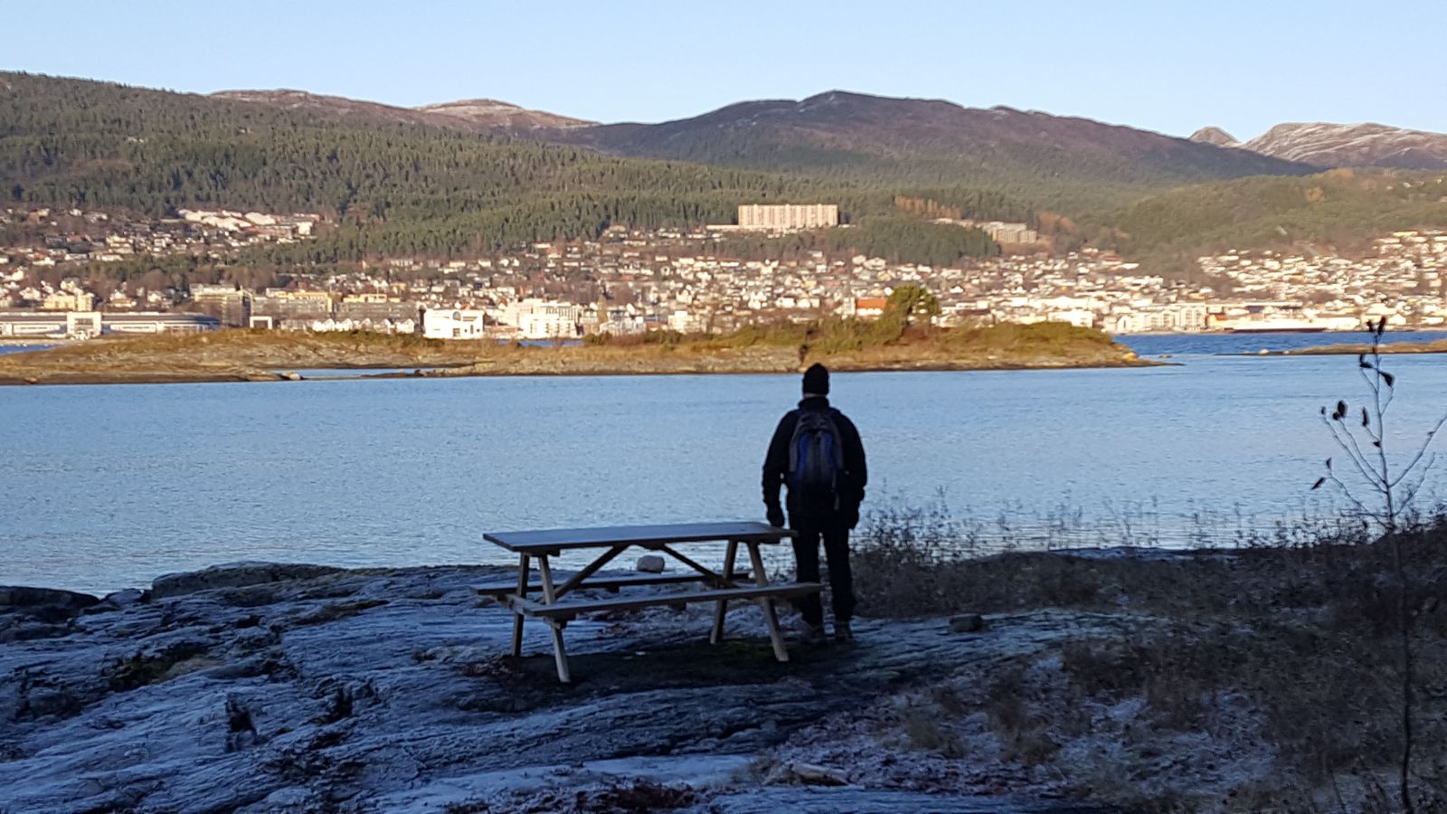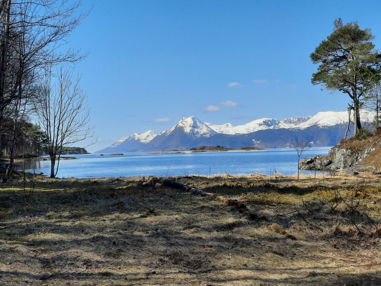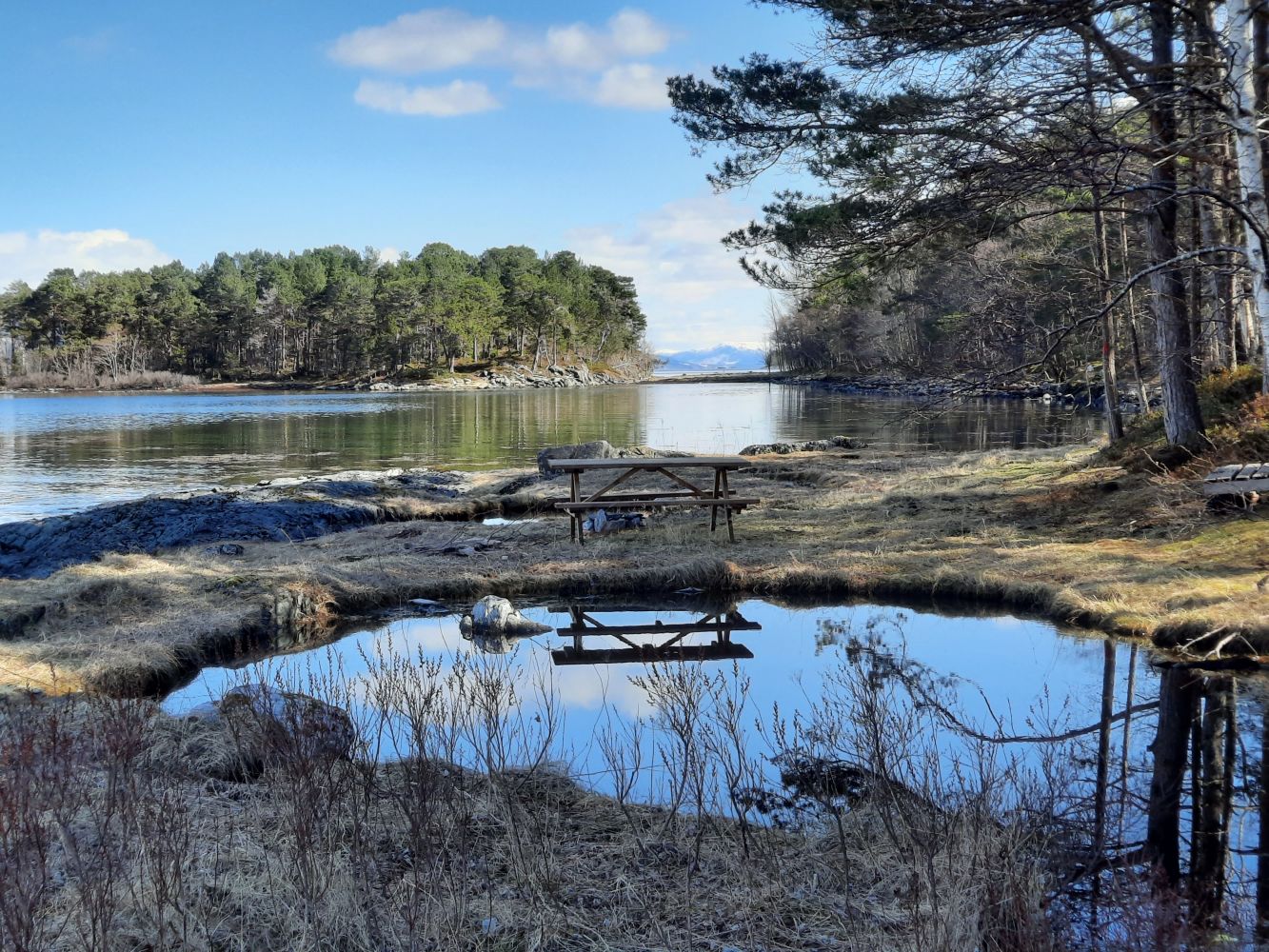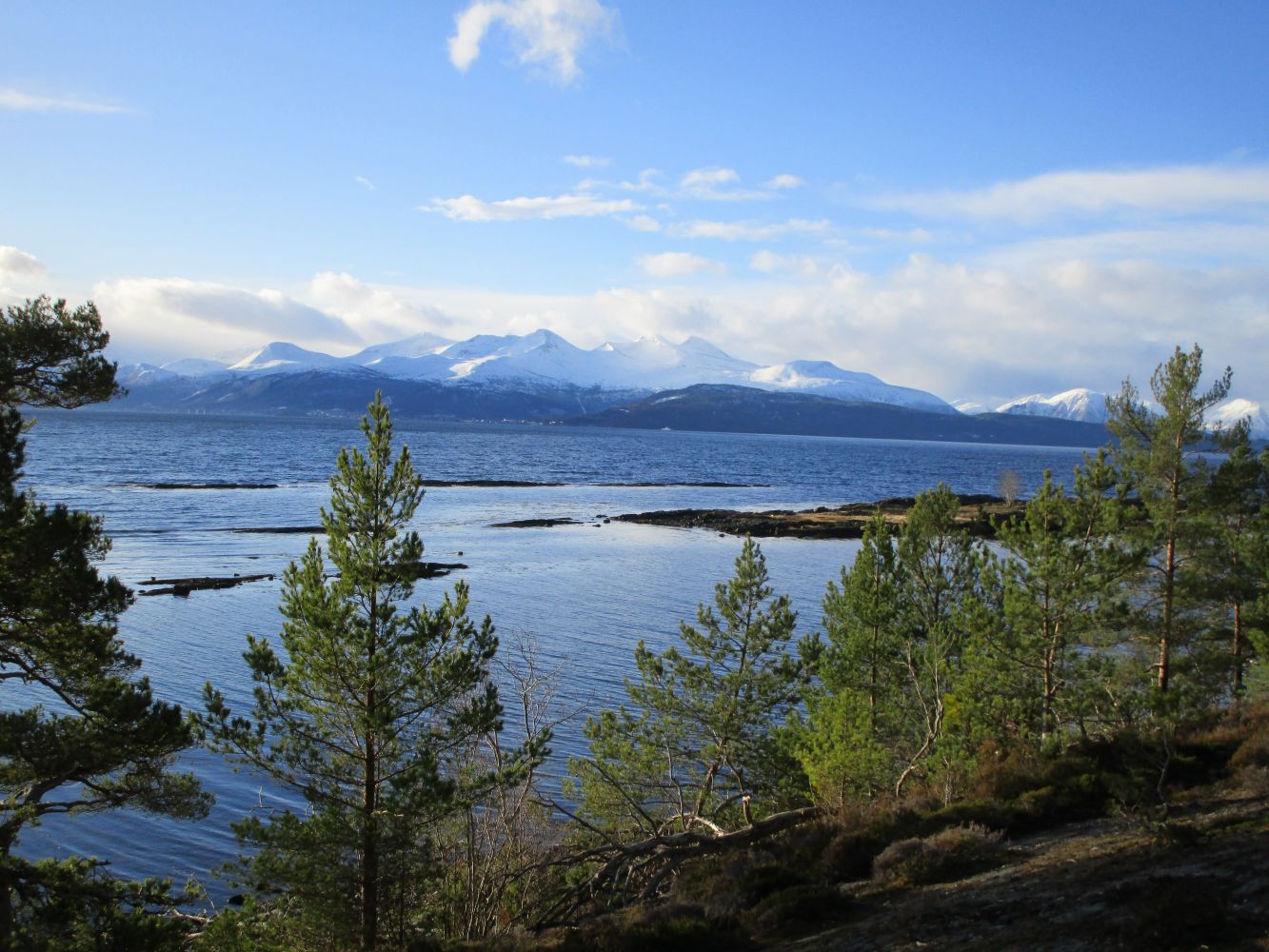 Når du kommer ned til sjøen går stien rett mot vest over et lite eid som også var slåttemark en gang. I Moldefjorden er himmelretningene svært greie. Alle øyene og Moldelandet er øst-vest. Står du her og ser mot byen, er den rett mot nord.
